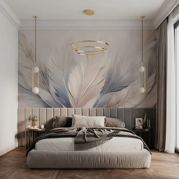 Zvolte užší pás nebo fotoobraz peří a slaďte s doplňky. Dobře vypadá i tapeta peří na panelu za postelí. Zvažte kombinaci s betonem pro kontrast.