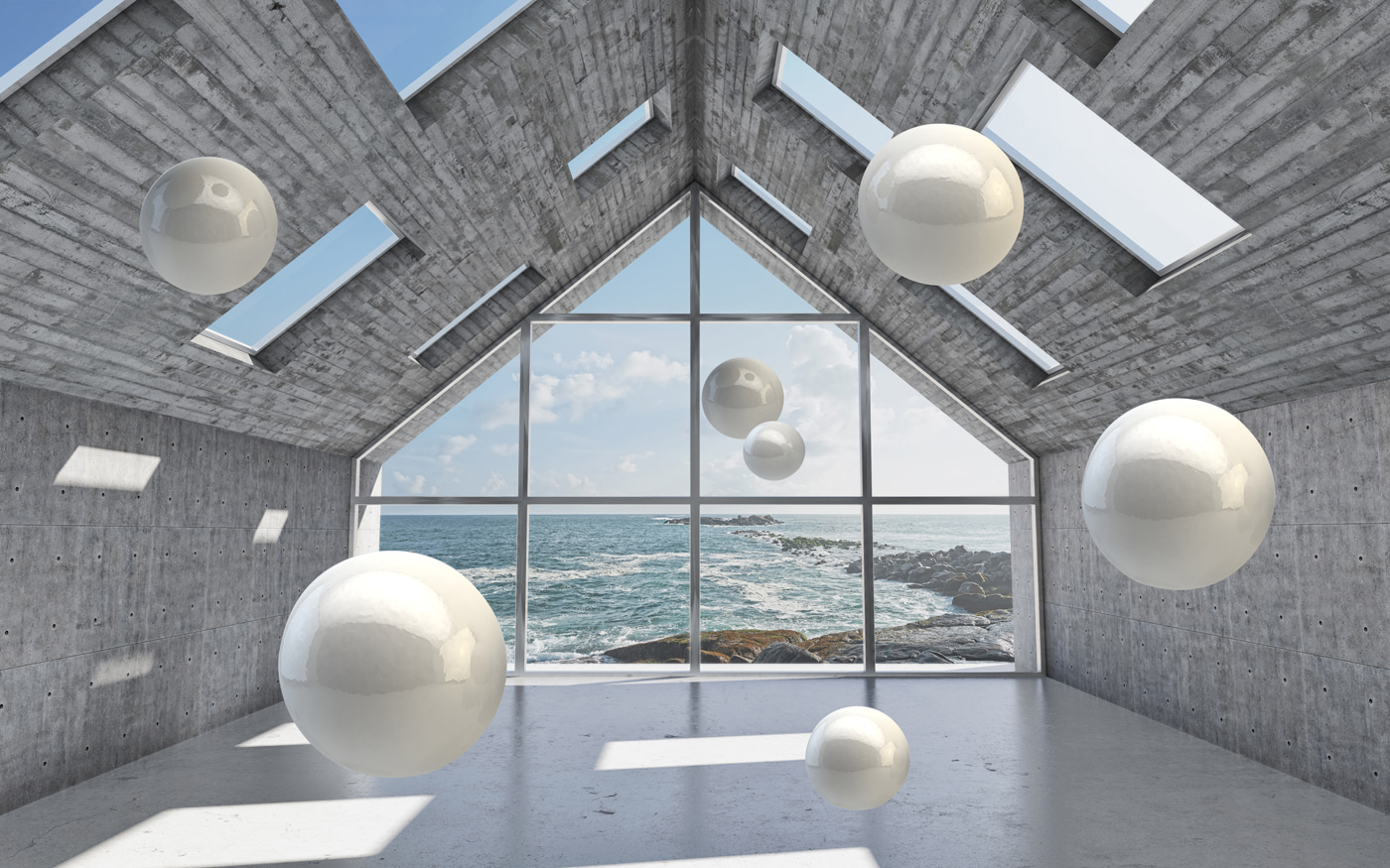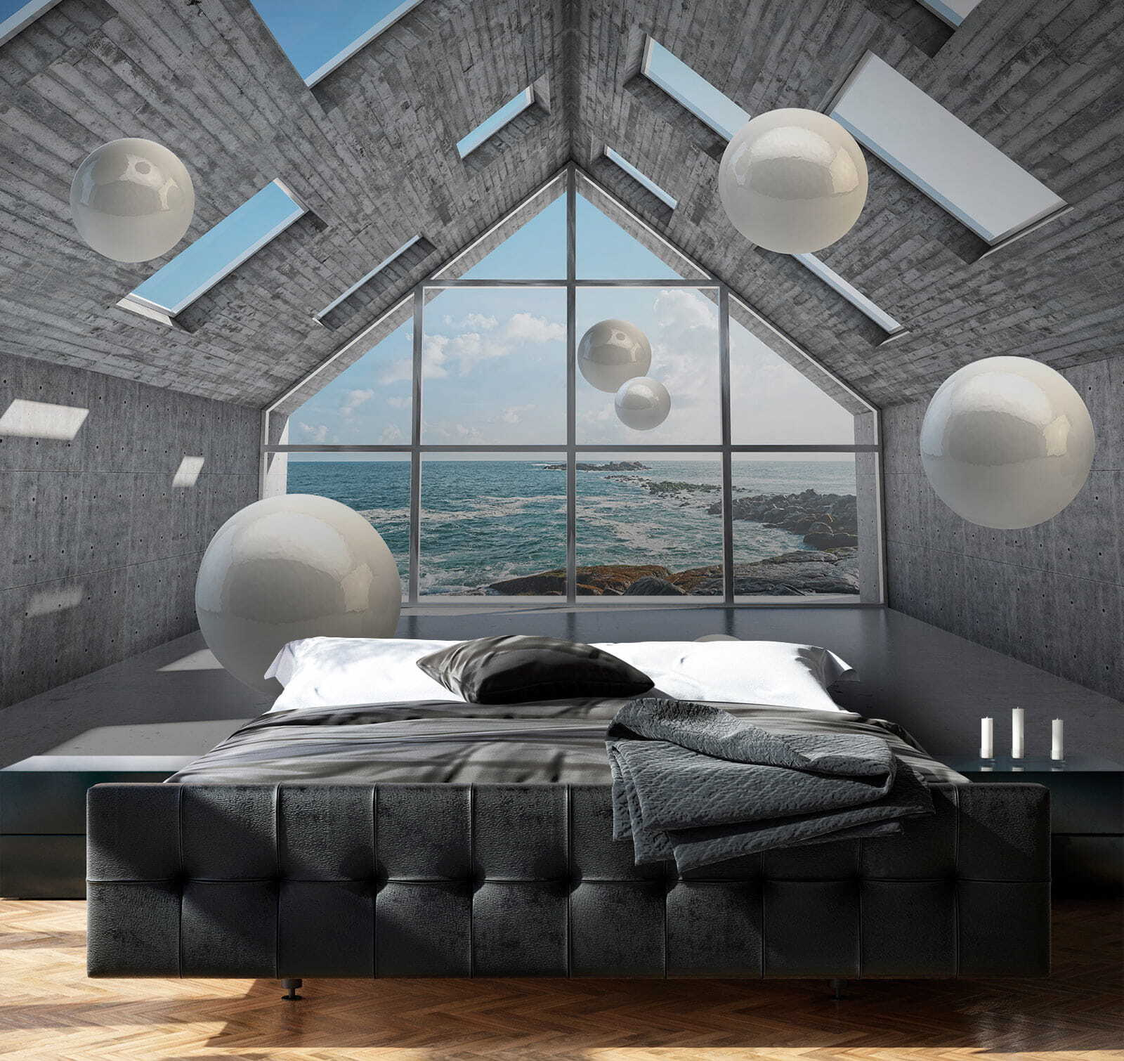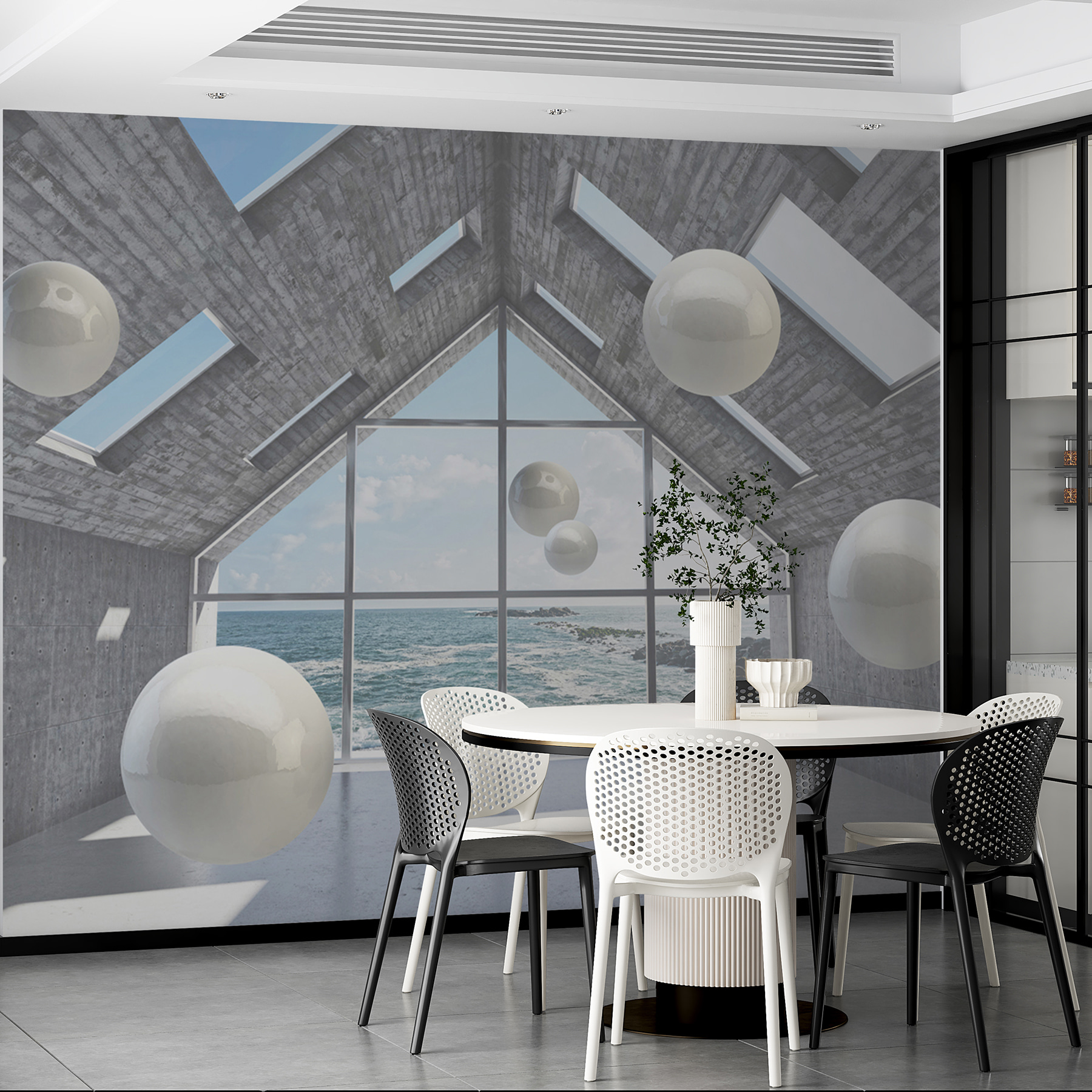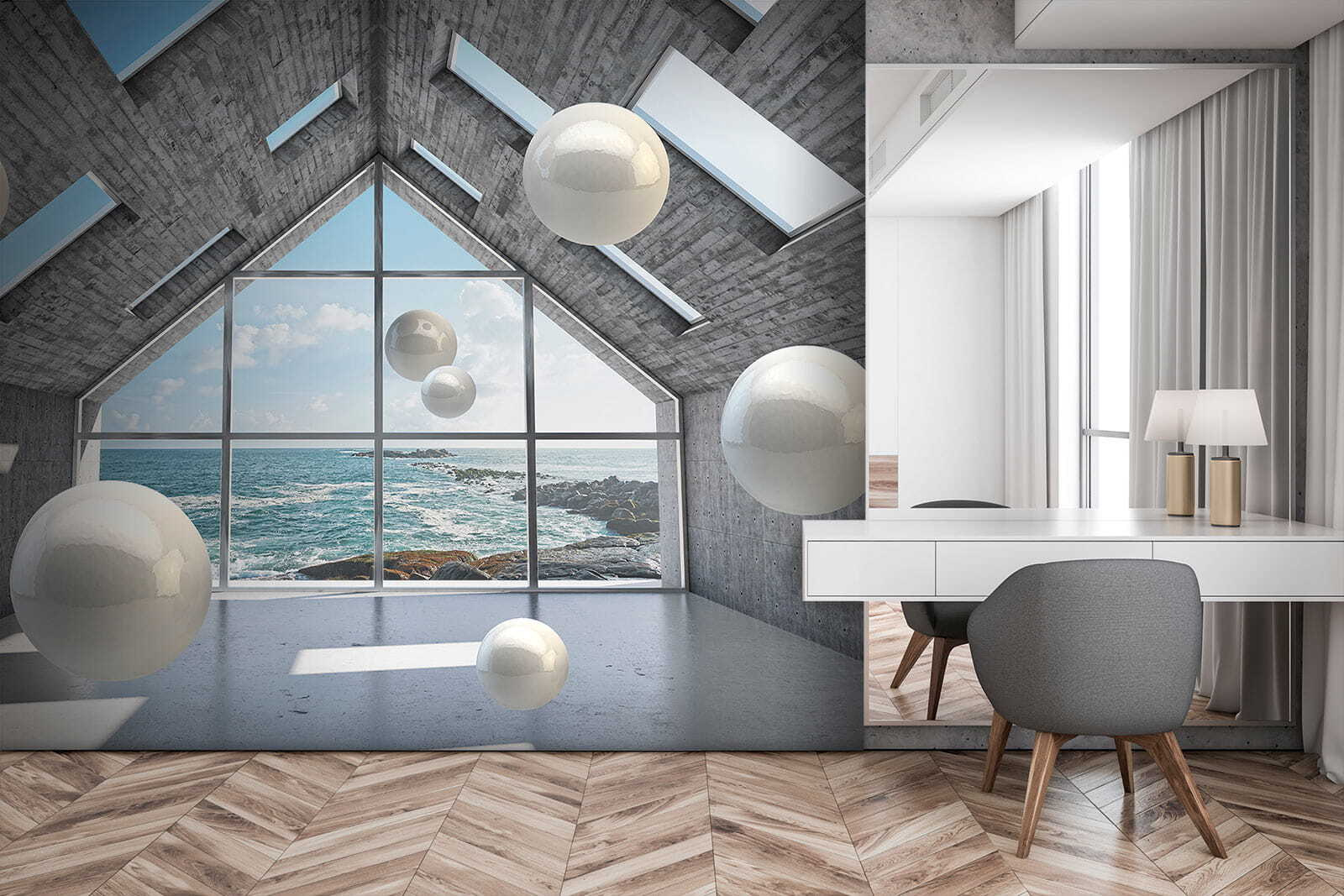 Proměňte svůj prostor ve snový únik pomocí této nástěnné malby bílé koule vznášející se v betonové místnosti. Je to jako vstoupit do umělecké instalace, aniž byste museli opustit pohodlí domova. Představte si, jak popíjíte kávu, ztraceni v myšlenkách, zatímco tyto elegantní koule jako by tančily kolem vás. Spojení moderního, industriálního vzhledu s tím fascinujícím výhledem na moře vytváří mrazivou atmosféru. Je ideální pro podnícení kreativity nebo jen pro chvilku oddechu. Ať už se nachází v útulném obývacím pokoji nebo v elegantní kanceláři, tato nástěnná malba vybízí ke zvědavosti a konverzaci a díky ní každá stěna ožije. Pociťte tu atmosféru!