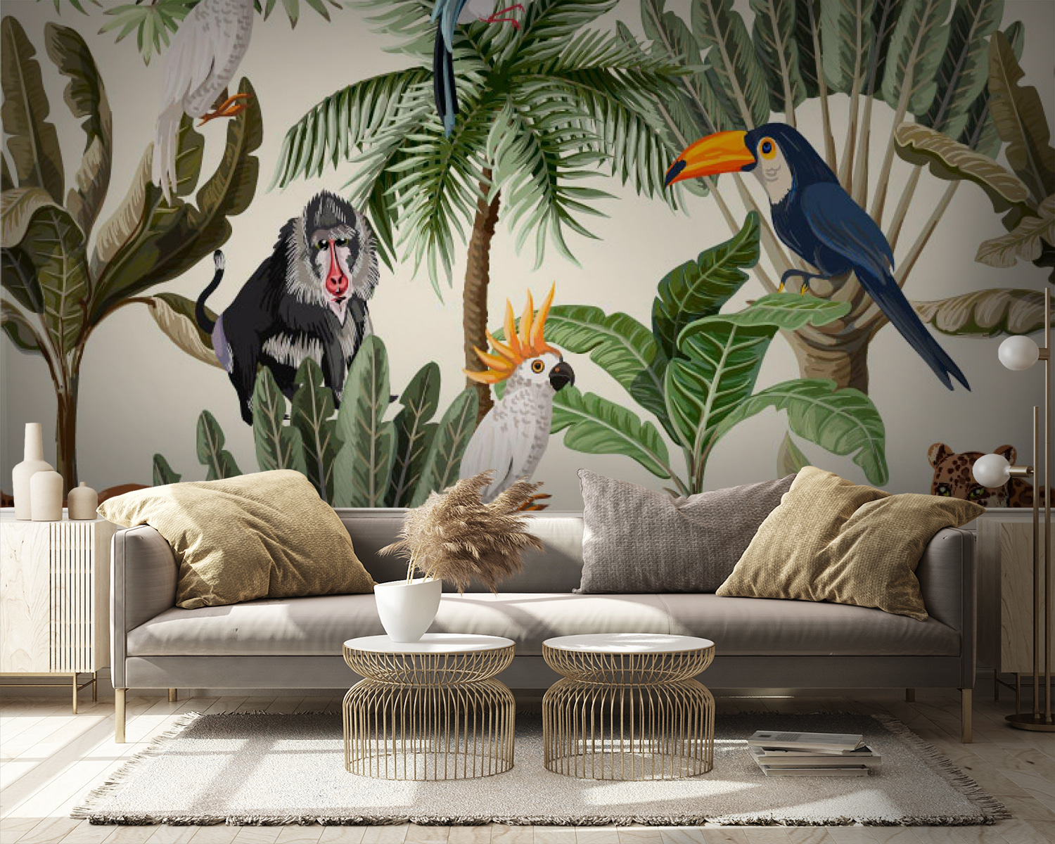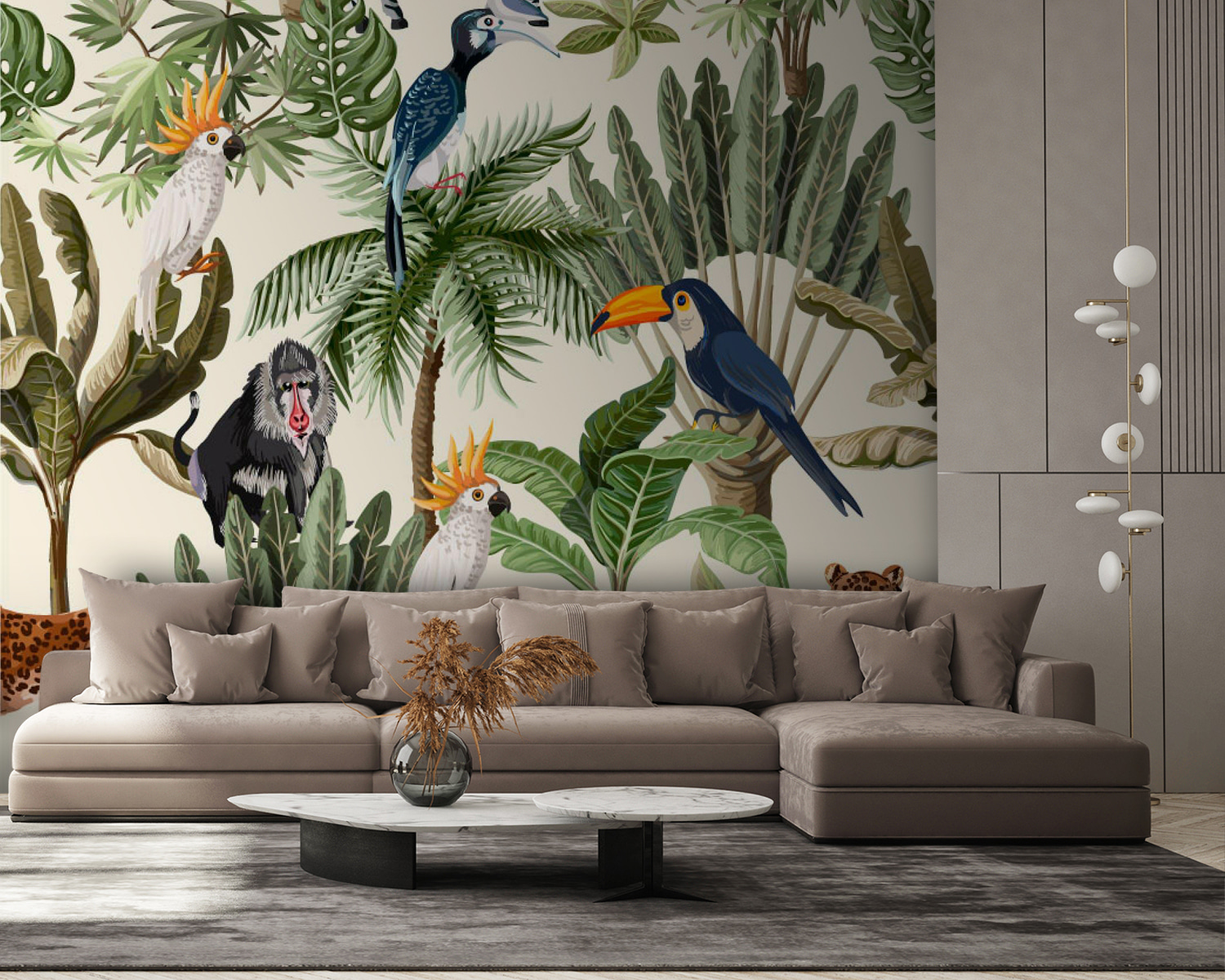 Proměňte každou místnost v tropický ráj s touto živou nástěnnou malbou s okouzlujícími rostlinami a exotickými ptáky, která je ideální pro ty, kteří touží po barevném nádechu! Představte si, že vejdete do svého prostoru a budete se cítit, jako byste byli přeneseni do svěží džungle. Hravé kombinace papoušků, leopardů a dalších živých zvířátek vybízejí k pocitu dobrodružství. Je to jako přenést si kousek přírody do interiéru – bez brouků! Tato nástěnná malba se skvěle hodí do dětského pokoje, obývacího pokoje nebo kamkoli jinam, kde by se hodila trocha veselí, a je příjemným podnětem ke konverzaci. Je neodolatelná!
