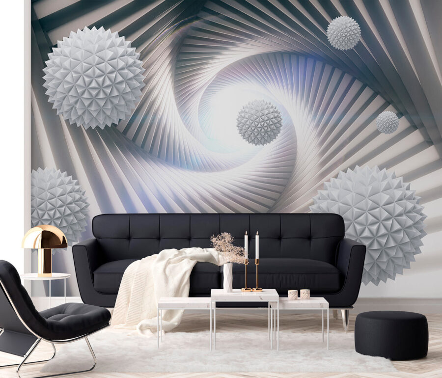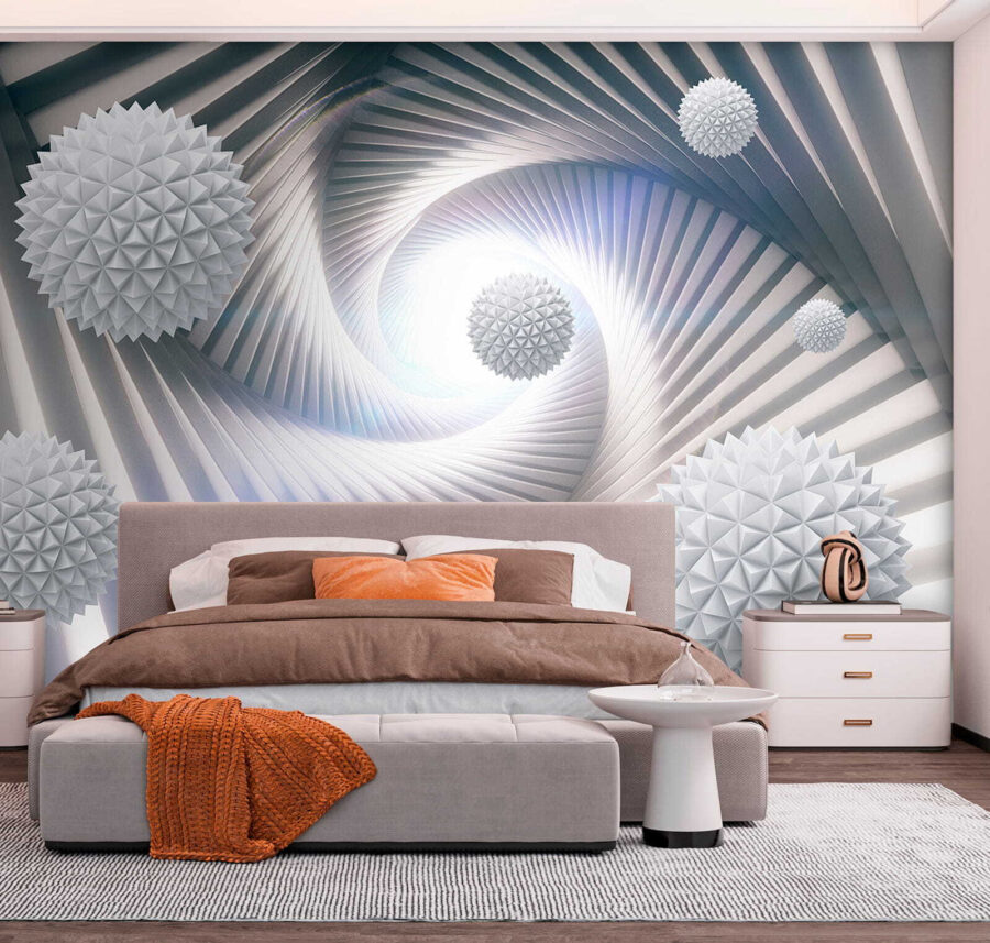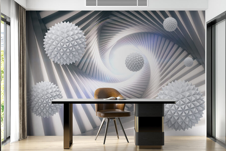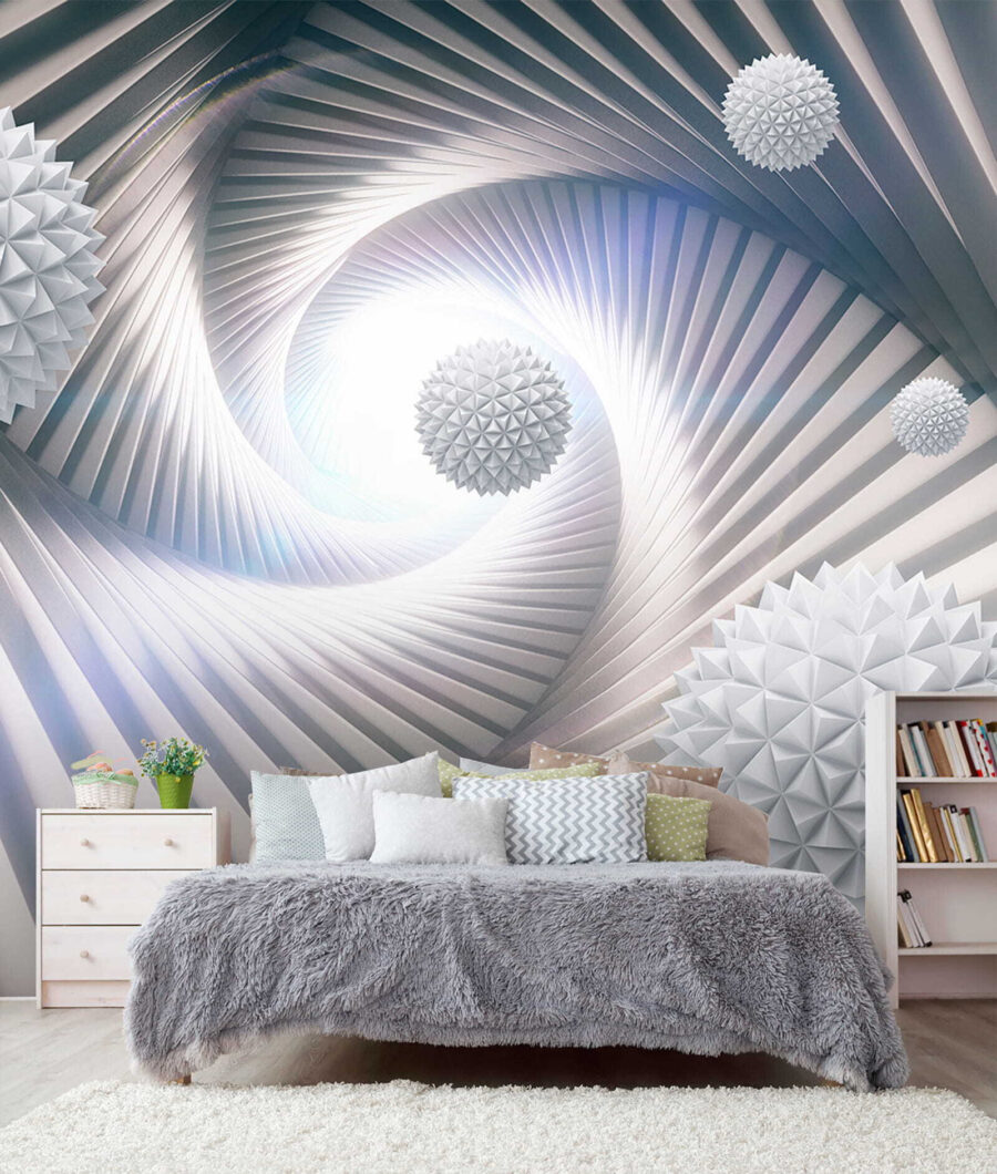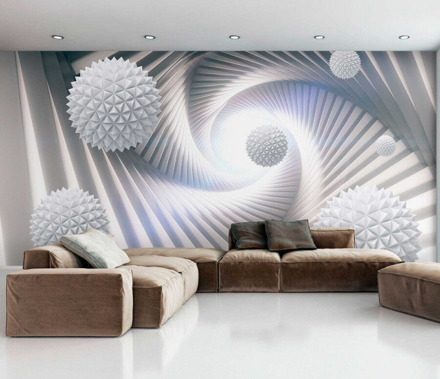 Proměňte svůj prostor pomocí této poutavé nástěnné malby “Nástěnná malba Bílá koule s trojúhelníky”. Je to jako procházka do zasněné geometrické říše divů. Představte si to: vstoupíte do místnosti a bum, tyto hravé, složité tvary se prostě odlepí od stěny. Není to jen dekor, ale vytváří to atmosféru – klidnou, ale zvědavě hřejivou.