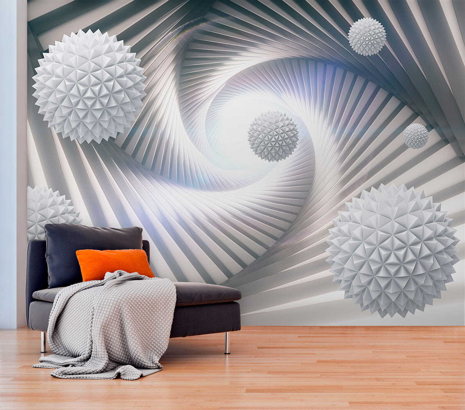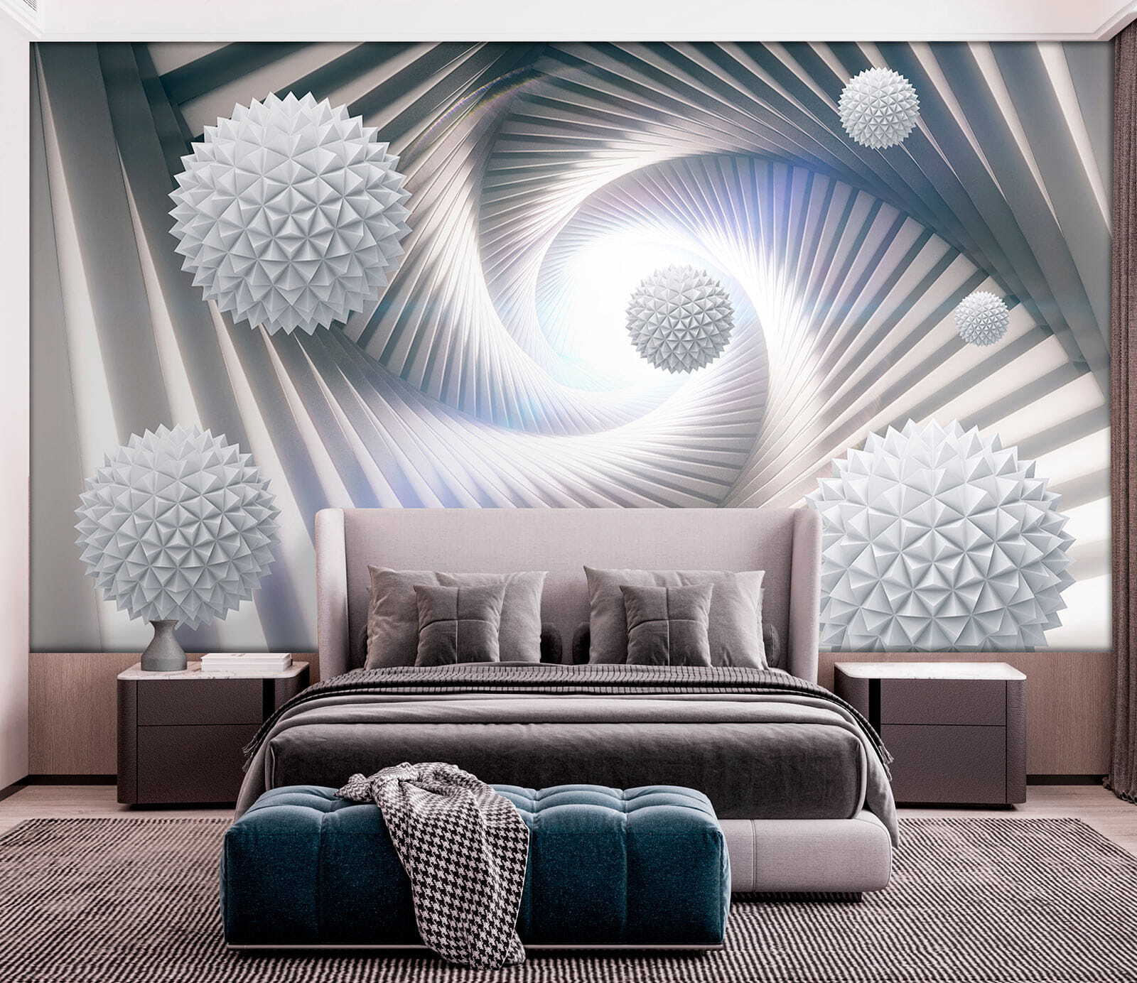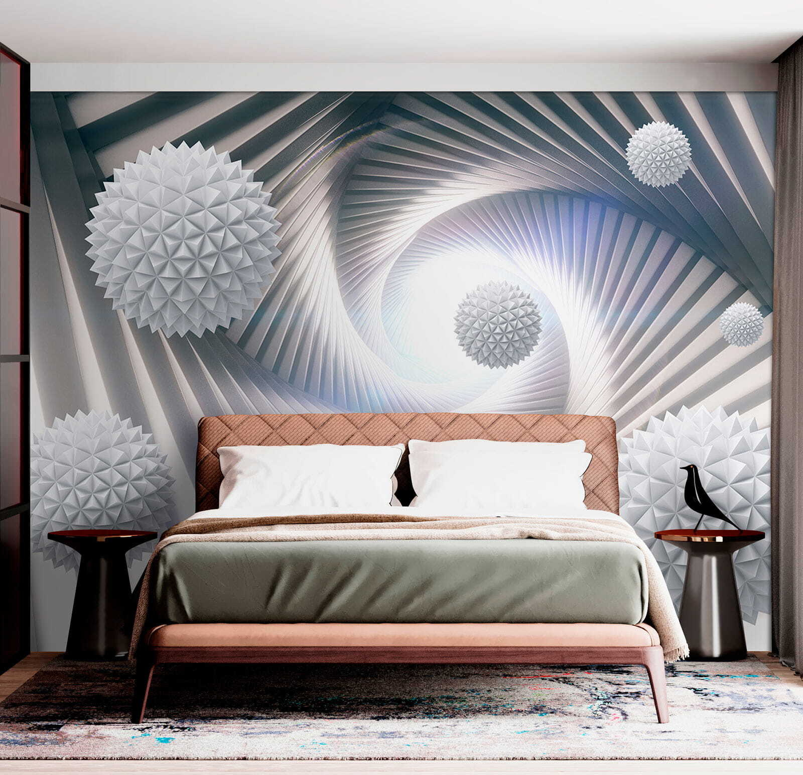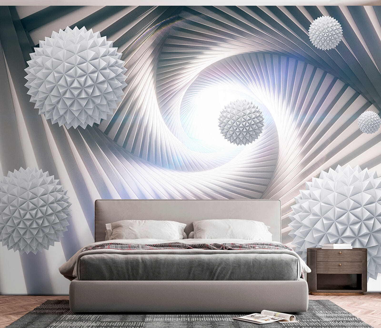 Proměňte svůj prostor pomocí této poutavé nástěnné malby “Nástěnná malba Bílá koule s trojúhelníky”. Je to jako procházka do zasněné geometrické říše divů. Představte si to: vstoupíte do místnosti a bum, tyto hravé, složité tvary se prostě odlepí od stěny. Není to jen dekor, ale vytváří to atmosféru – klidnou, ale zvědavě hřejivou.