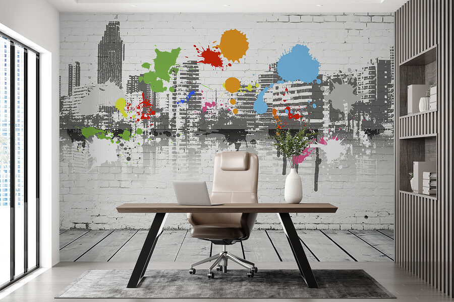 Tato nástěnná malba změní každý prostor! Jmenuje se “Modrá skvrna na bílé cihlové zdi”, ale dokáže mnohem víc než jen přidat barvu. Představte si, že se každý den probouzíte s tímto pohledem – jasné, hravé stříkance modré, zelené a další zářivé barvy na pozadí chladné siluety městské krajiny. Je to jako dodat svému pokoji příval tvůrčí energie bez jakéhokoli nepořádku!