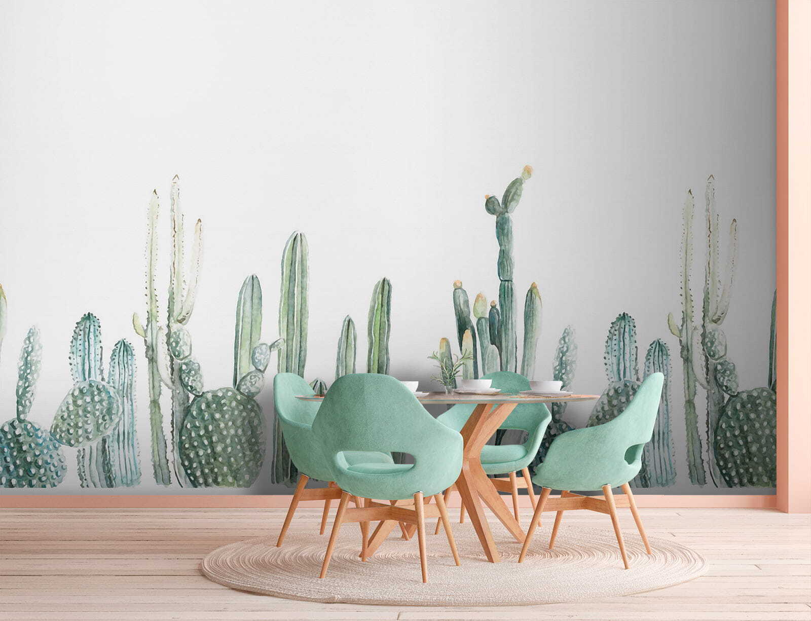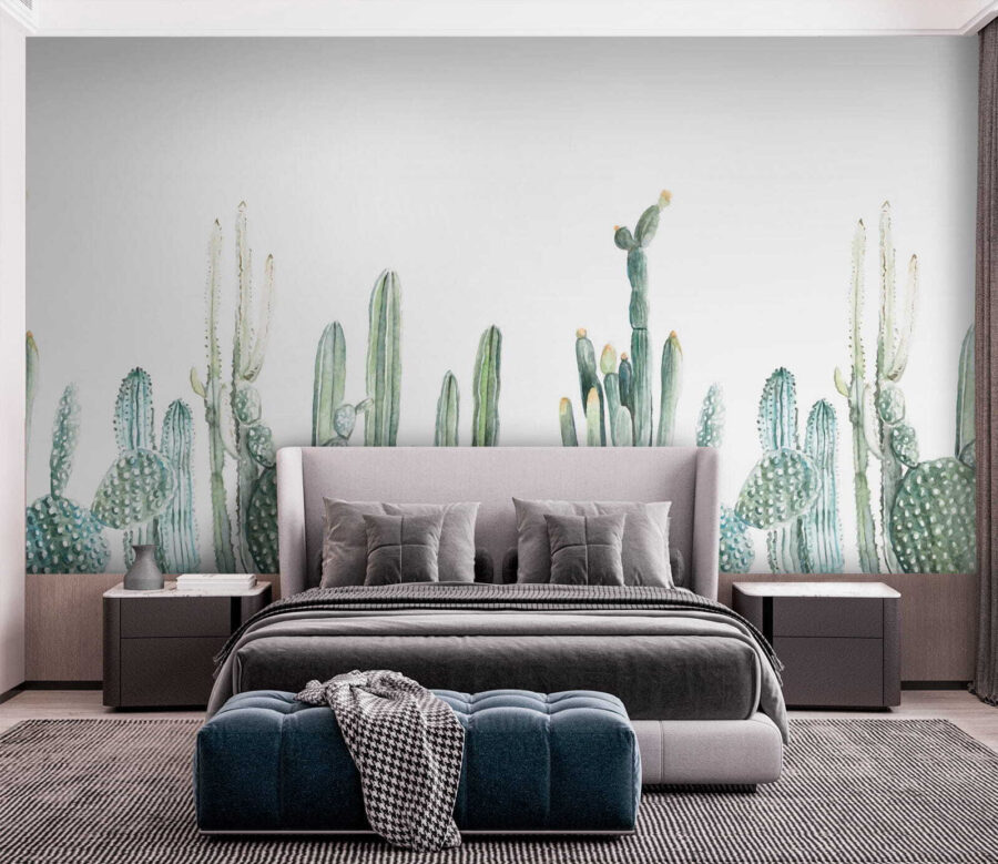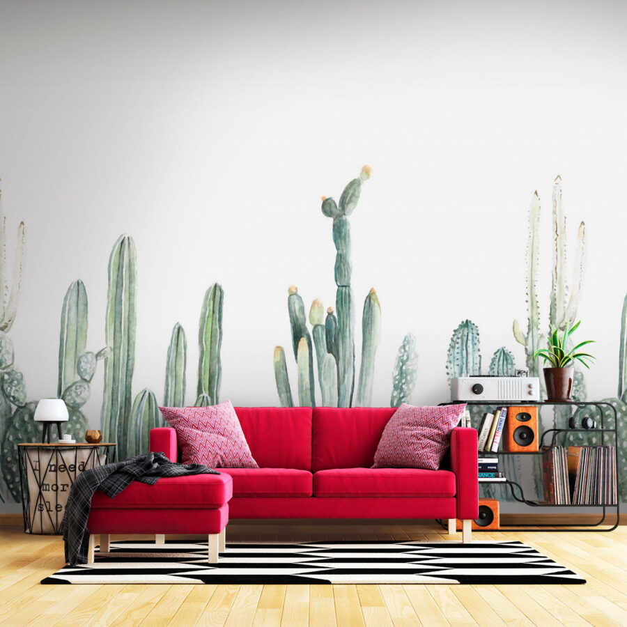 S touto nádhernou nástěnnou malbou s akvarelovými kaktusy v půvabných řadách proměníte každou místnost v pouštní oázu. Představte si to: vejdete do svého prostoru a najednou je to jako procházka klidnou zahradou, bez nutnosti používat opalovací krém. Měkká zeleň a hravé tvary přinášejí pocit klidu, takže je ideální pro útulný čtecí koutek nebo živý obývací pokoj. Je to skoro jako mít domácího kaktusu – bez náročné péče. Tato nástěnná malba našeptává teplo a klid a zve každého, kdo vstoupí, k relaxaci a odpočinku. Tak směle do toho, nechte své stěny dýchat životem!