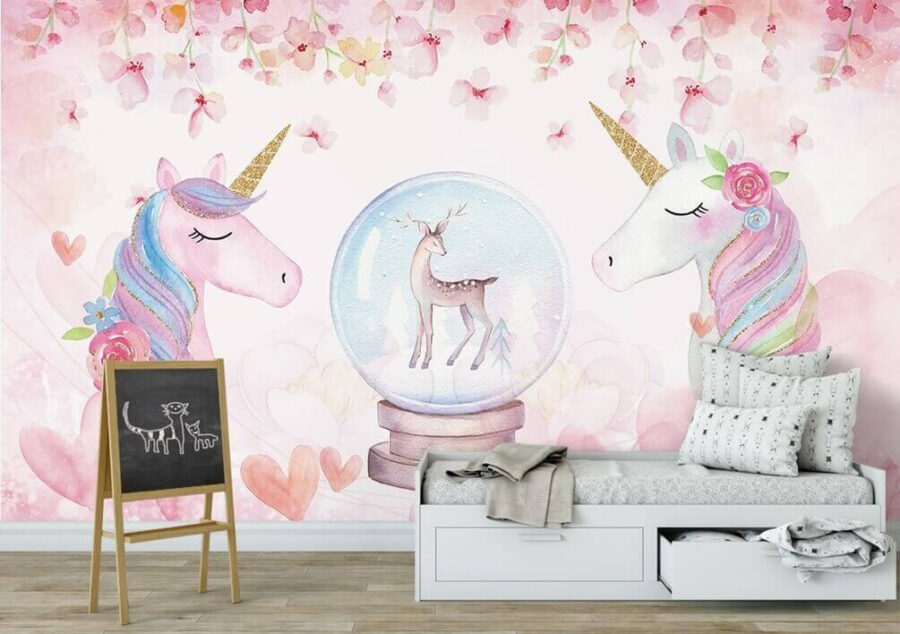 Tato nástěnná malba s něžnými jednorožci uprostřed jemných růžových květinových odstínů a úžasným jelenem ve sněhové kouli působí, jako by vypadla přímo z pohádky. Jemné akvarelové odstíny působí uklidňujícím dojmem, zatímco hravé detaily podněcují fantazii a rozmar.