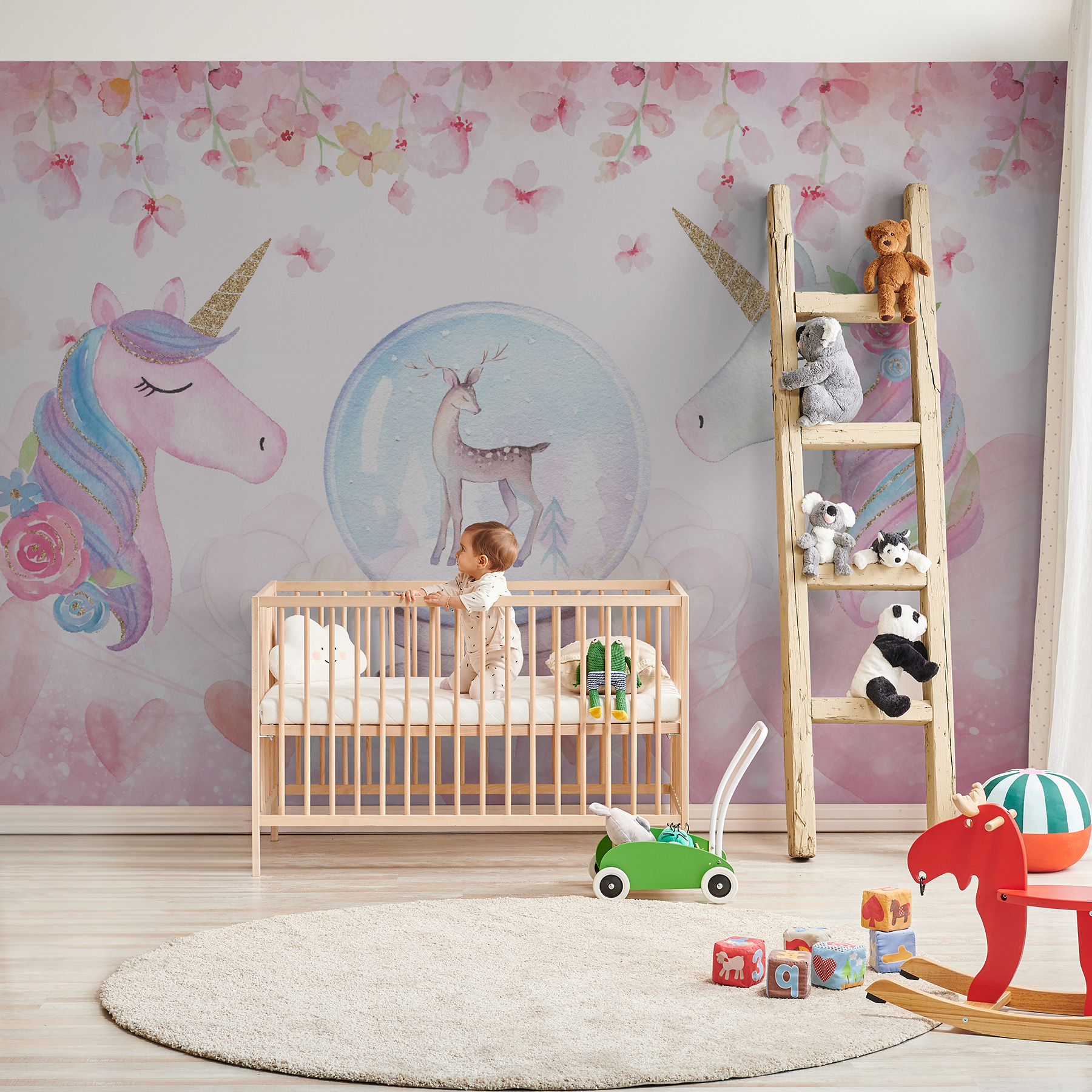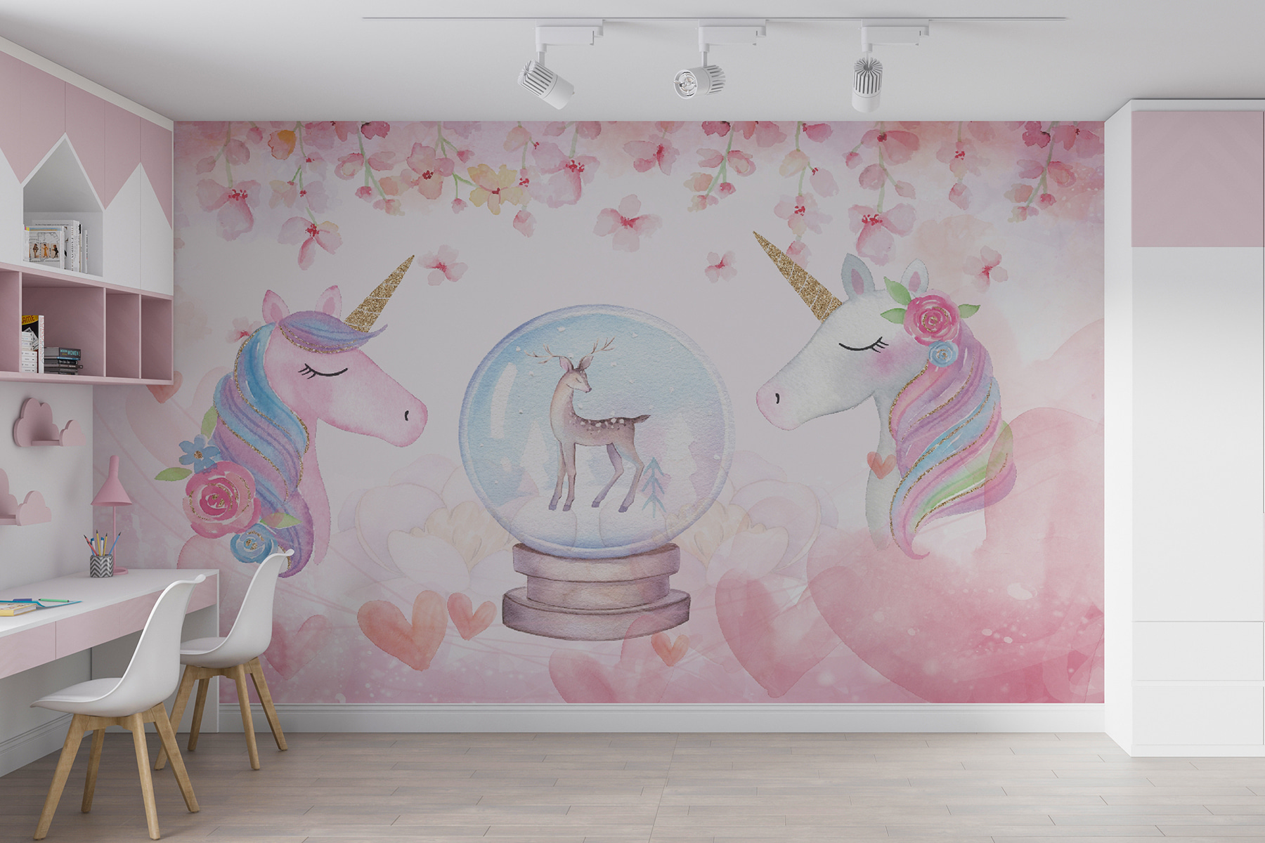 Tato nástěnná malba s něžnými jednorožci uprostřed jemných růžových květinových odstínů a úžasným jelenem ve sněhové kouli působí, jako by vypadla přímo z pohádky. Jemné akvarelové odstíny působí uklidňujícím dojmem, zatímco hravé detaily podněcují fantazii a rozmar.
