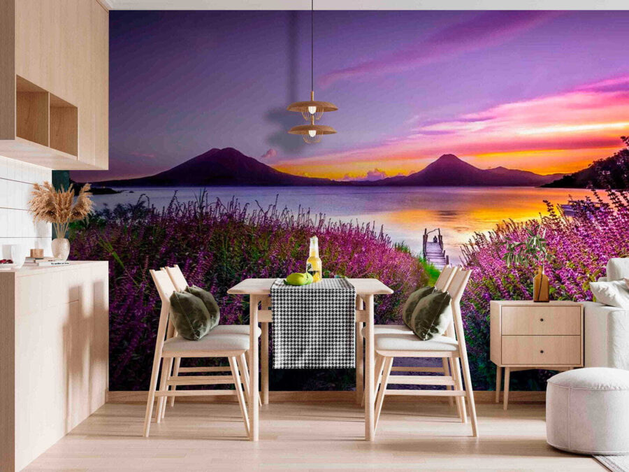 Představte si, že při každém pohledu na zeď vstoupíte do klidného úniku. Tato nástěnná malba s klidnou cestou vedoucí k třpytivému jezeru orámovanému zářivě fialovými květy vás vtáhne přímo do náruče přírody. Uklidňující fialové a modré barvy vytvářejí klidnou atmosféru, která je ideální pro útulný čtecí koutek nebo příjemný vstupní prostor. Když slunce klesá pod obzor, tyto jemné odstíny vybízejí k pocitu klidu. Je to jako minidovolená přímo u vás doma, kde se při každém pohledu může svět venku zdát o něco klidnější a jasnější. Ideální pro denní snění nebo prostě jen pro odpočinek.
