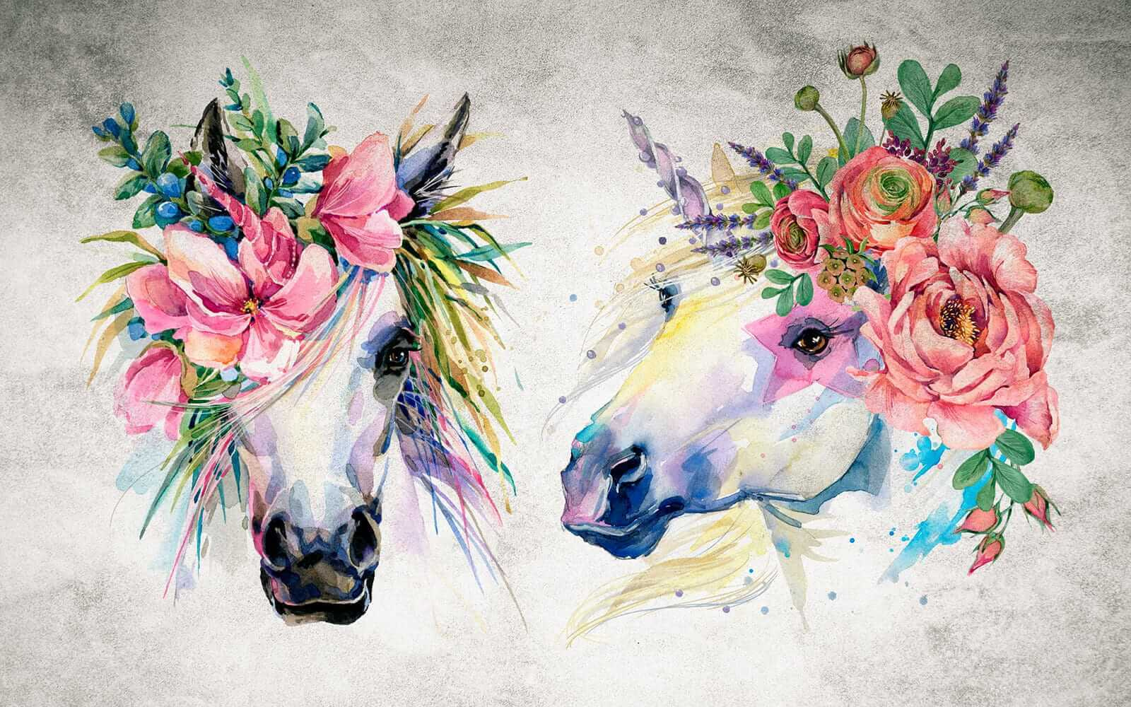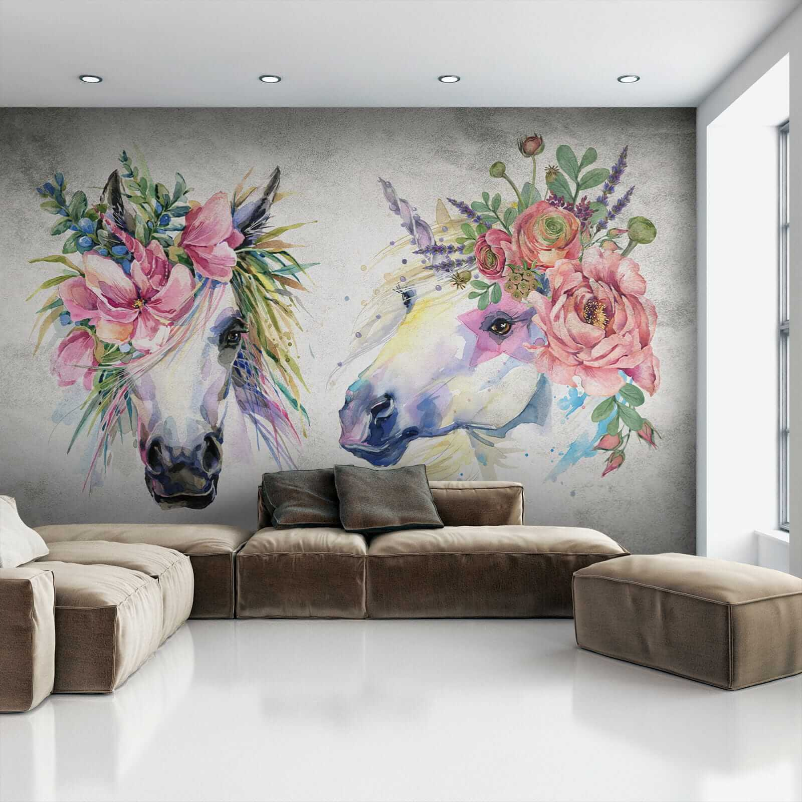 Představte si, že vejdete do místnosti a přivítají vás tito úžasní koně ozdobení květinovými korunami! Tato živá nástěnná malba vnese do každého prostoru příval barev a rozmarů – ideální do dětského pokoje, dětského pokoje nebo třeba do kreativního studia. Akvarel působí prostě snově, skoro jako byste vstoupili do pohádkové zahrady. Jemné květy a výrazné oči koní dodávají nádech kouzla a klidu, kterému je těžké odolat.