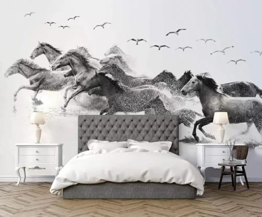 Podívejte se na tuto úžasnou nástěnnou malbu – představte si skupinu majestátních koní, kteří se cákají ve vodě, zachycenou v úchvatné černobílé barvě. Je to jako mít kus syrové energie přírody přímo na zdi. Perfektně se hodí do jakéhokoli prostoru, který potřebuje nádech dynamiky; tito cválající krasavci jsou plní života a pohybu, díky čemuž každá místnost působí živěji a živěji.