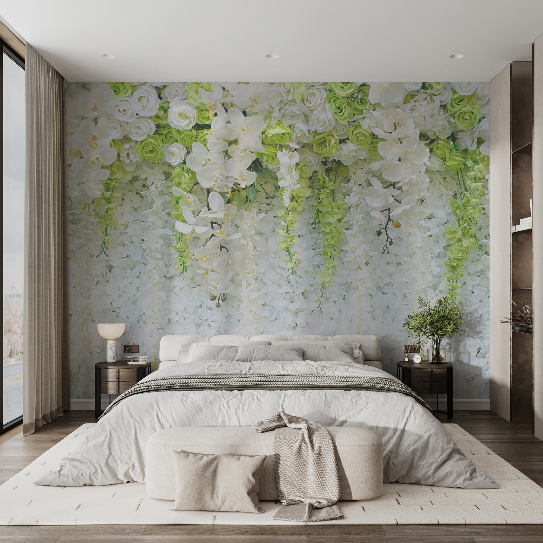 Představte si, že vejdete do místnosti a přivítá vás ohromující kaskáda bílých a zelených květů zdobících stěnu. Tato nástěnná malba “Skupina bílých a zelených květin” je jako vstoupit do klidné zahrady, aniž byste museli opustit svůj domov. Detaily jsou působivé – téměř máte pocit, že byste mohli natáhnout ruku a dotknout se okvětních lístků. Je ideální pro dodání jemného, přírodního nádechu do každé místnosti.