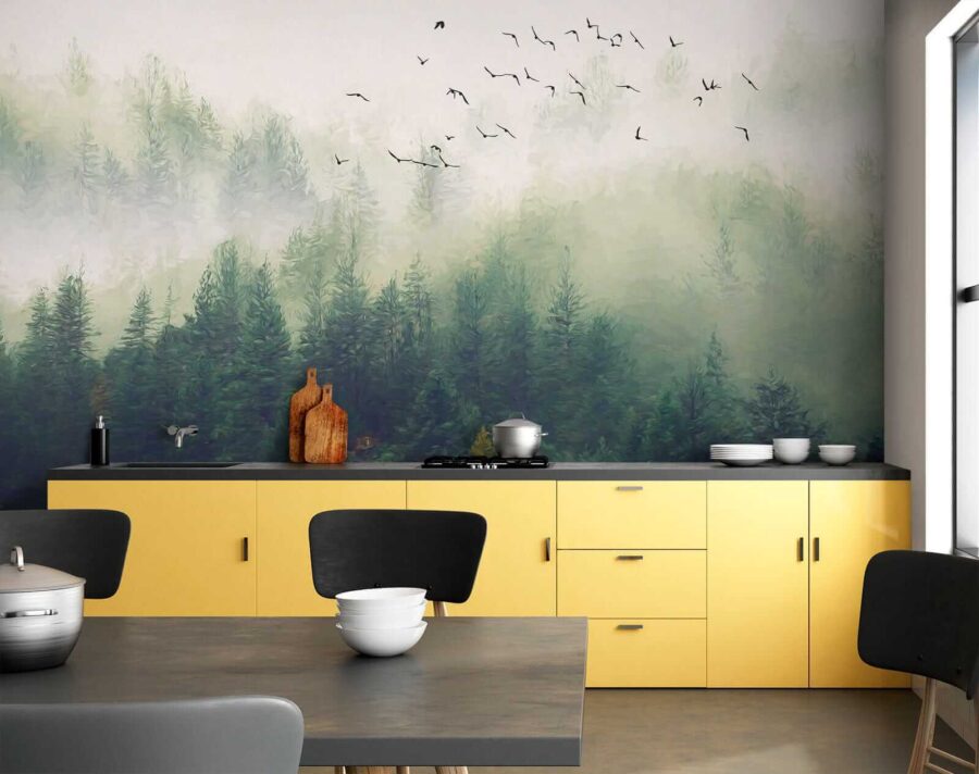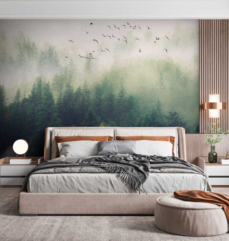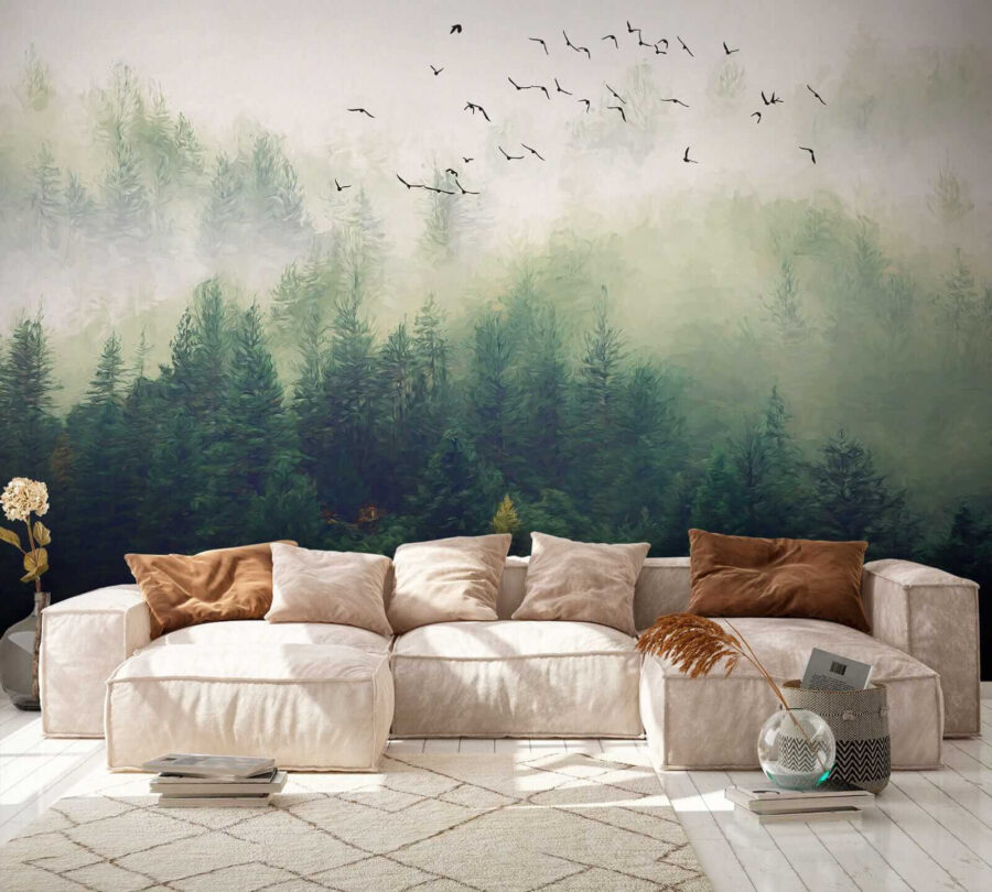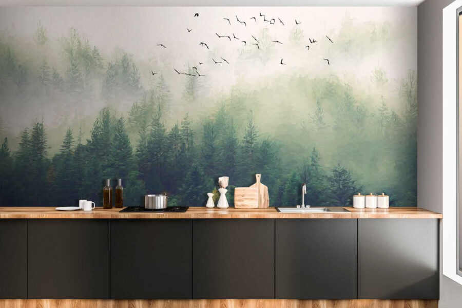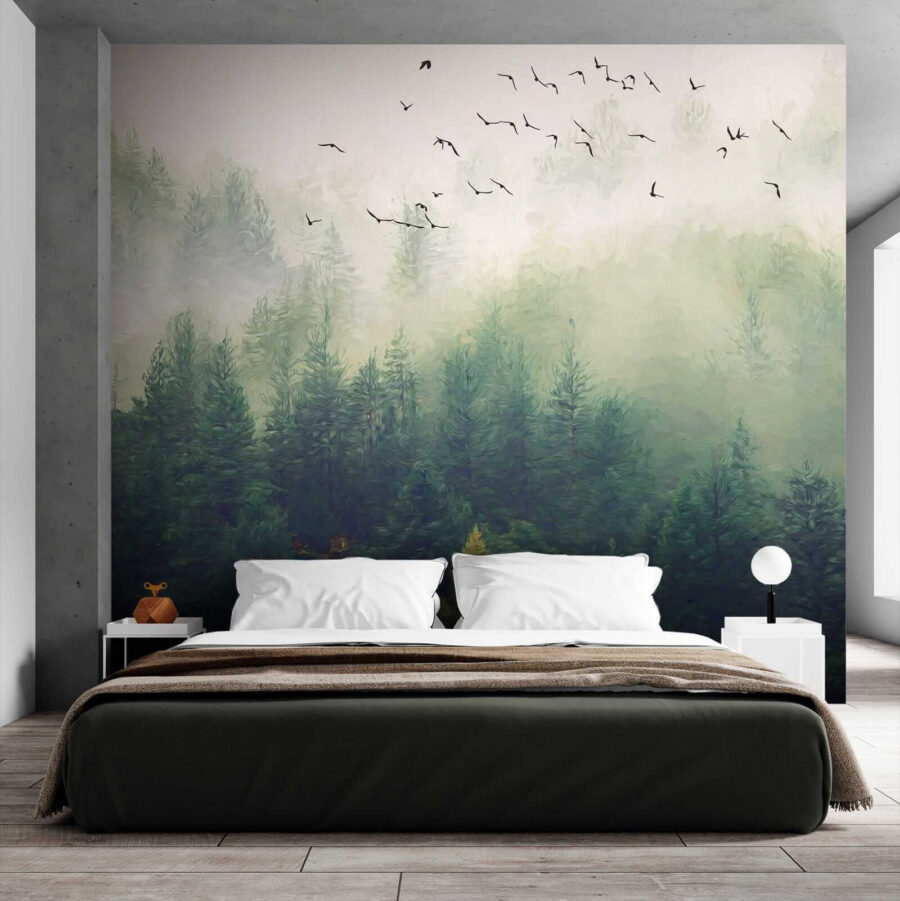 Proměňte svůj prostor pomocí této úchvatné tapety s motivem ptáků letících nad zamlženým lesem. Představte si, že vstoupíte do klidného útočiště přímo ve svém obývacím pokoji! Jemné zelené odstíny a měkká mlha vás obklopí jako útulná deka, zatímco ptáci vás jako by zvou, abyste se připojili k jejich cestě. Je to, jako by se příroda rozhodla sama vyzdobit váš domov!