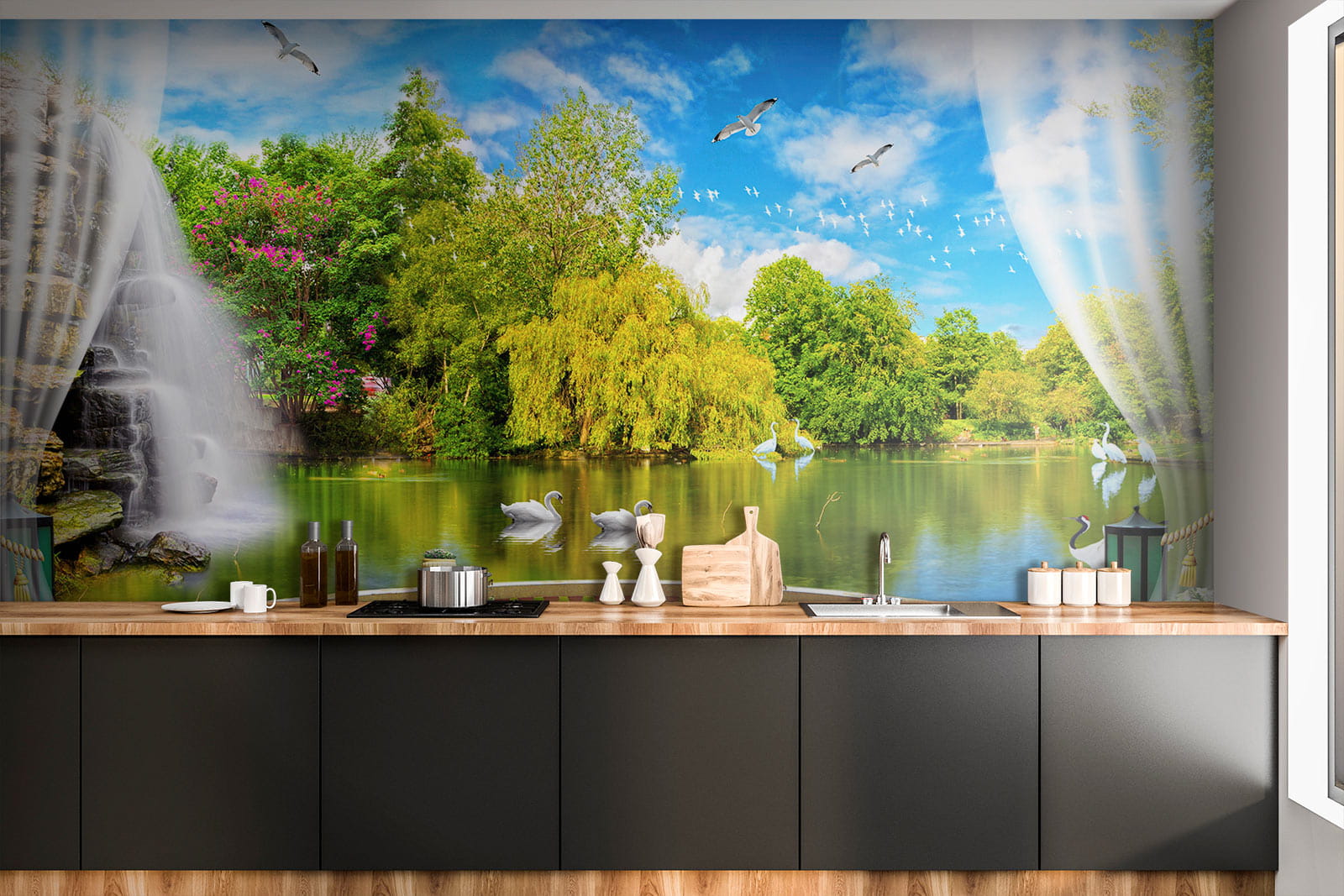 Transform any room into a tranquil oasis with this charming mural, “View of a Pond with Birds and Trees.” Imagine sipping your morning coffee, and suddenly the chaos of the world fades—just you, serene waters, and graceful swans gliding by. The vibrant greens and lively blues bring nature right to your walls, making every day feel like a leisurely stroll by the water. Perfect for a cozy nook or a vibrant living room, this mural isn’t just decor; it’s a little slice of peace that whispers, “Take a breath, you deserve it.” Isn’t it time to embrace those calming vibes?