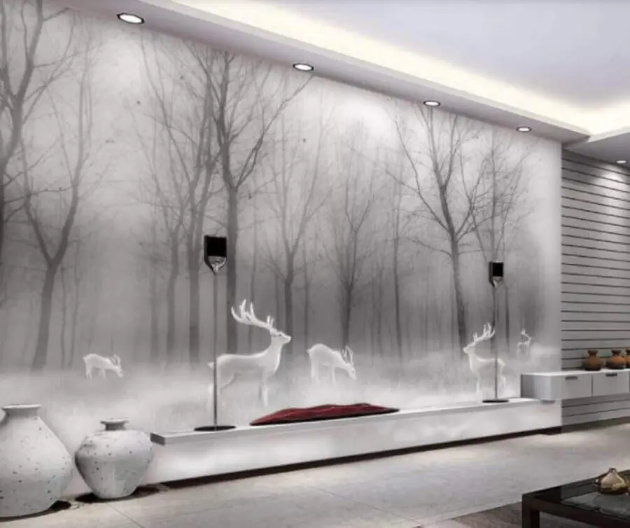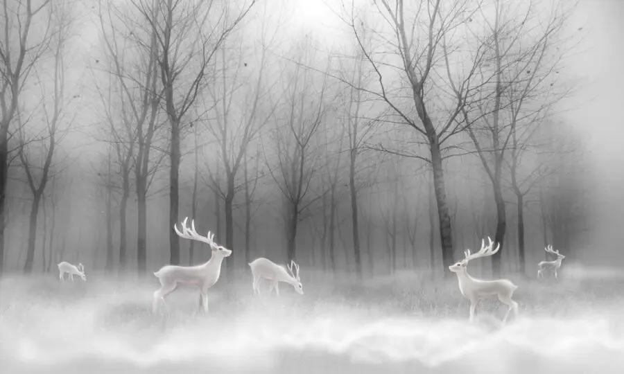 Transform your space with this enchanting mural featuring a group of graceful white deer wandering in a mystical foggy forest. Imagine stepping into your home and feeling like you’ve just walked into a serene winter wonderland. Those majestic deer, seemingly caught in a moment of quiet magic, bring a calm and dreamy vibe that’s hard to resist.