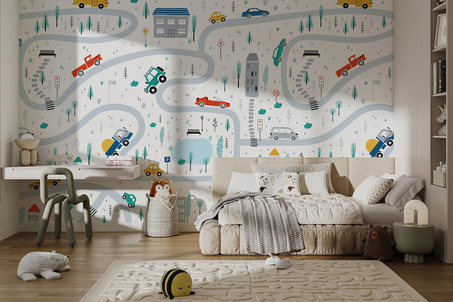 Máte dítě, které miluje auta a budovy? Tato “Nástěnná mapa aut a budov” je naprostým snem! Představte si – živé silnice vinoucí se po celé stěně, barevná auta jezdící kolem a okouzlující malé budovy poseté scénou. Je to jako žít v miniaturní městské krajině! Tato nástěnná malba rozzáří každý dětský pokoj a promění obyčejné stěny v hravé dobrodružství. Perfektní pro vyprávění příběhů nebo podněcování fantazie malého dítěte – jen si představte, jaké příběhy se budou odehrávat před spaním! Jemné barvy a rozmarné kresby navíc zútulní a rozveselí prostor. Není to jen nástěnná malba, je to pozvánka k objevování, snění a každodenní hře.
