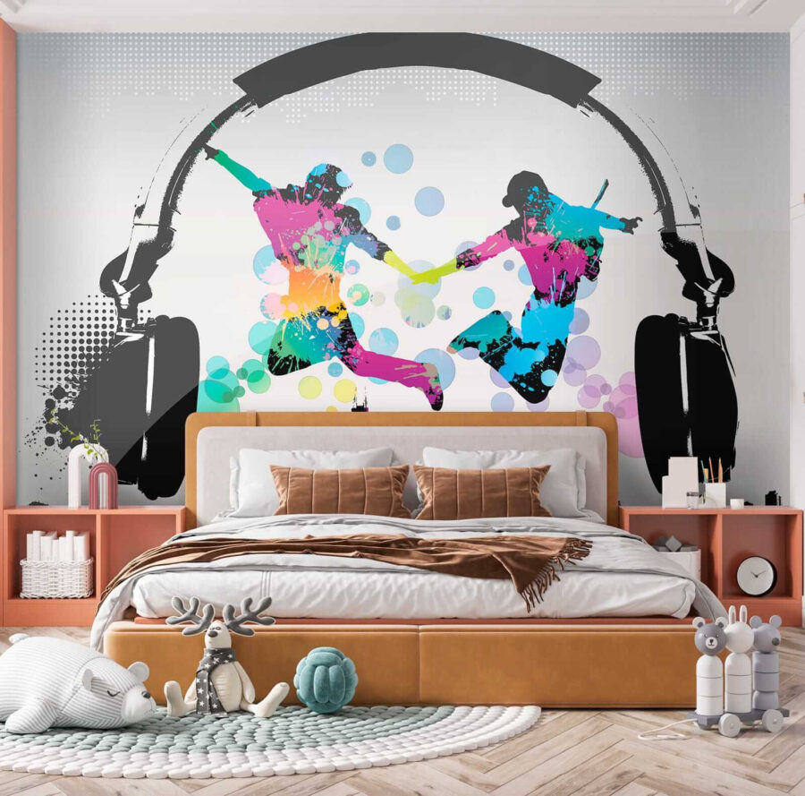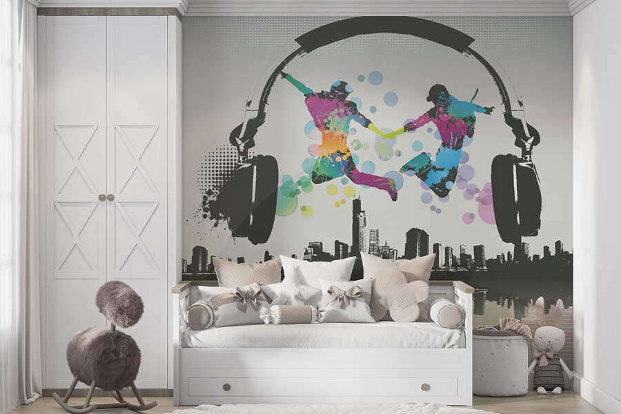 Na návrhu jsou dvě postavy, které bujarým způsobem skáčou na pozadí městské krajiny a obřích sluchátek – jako by tančily ve vlastním rytmu a vyzývaly každého, kdo je uvidí, aby se k zábavě připojil. Odvážné barevné cákance okamžitě upoutají vaši pozornost a zvednou vám náladu! Navíc se nachází v kategoriích jako “Designové tapety na zeď” a “Oblíbené nástěnné malby”, takže víte, že jste narazili na něco výjimečného.