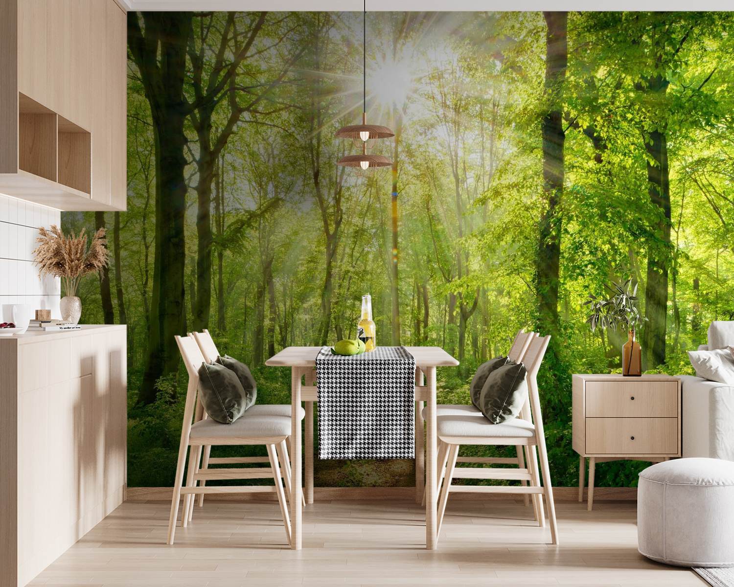 Proměňte svůj prostor pomocí této úchvatné nástěnné malby se slunečními paprsky pronikajícími skrz svěží stromy. Představte si, že vejdete do svého pokoje a máte pocit, že jste vstoupili do klidného lesa – dokonalé relaxační zóny přírody. Zářivá zeleň vyniká a zve ke klidným vibracím, téměř jako byste slyšeli jemné šumění listů. Ať už je to váš čtecí koutek, nebo místo pro živé setkávání, tato nástěnná malba hraje rozkošný trik na smysly. Je to jako závan čerstvého vzduchu pro vaše stěny, který vytváří dokonalé pozadí pro útulné rozhovory nebo klidné chvíle o samotě. Navíc je prostě příjemné si myslet, že kousek přírody může přinést takovou radost do interiéru.