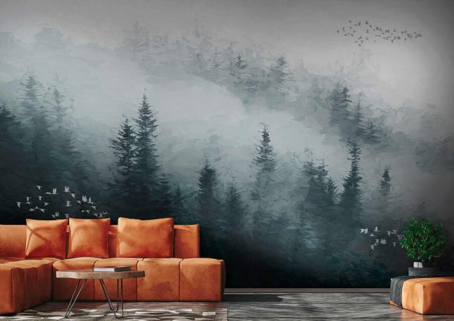 S nástěnnou malbou “Mlžný les s poletujícími ptáky” proměníte každou místnost v klidné útočiště. Představte si, že se probouzíte do mlžných stromů a jemného hejna ptáků plachtících vzduchem. Je to jako přenést kousek divočiny do interiéru – ideální pro útulný obývací pokoj nebo klidnou ložnici. Uklidňující odstíny zelené a šedé vytvářejí atmosféru, která vybízí k relaxaci a snění. Představte si, že se schoulíte do klubíčka s dobrou knihou, posloucháte tichou hudbu a cítíte se naprosto klidně – je to jako klid přírody obklopující vaše stěny. Krásný doplněk pro ty, kteří touží po pohodové atmosféře, aniž by museli vstoupit do přírody!