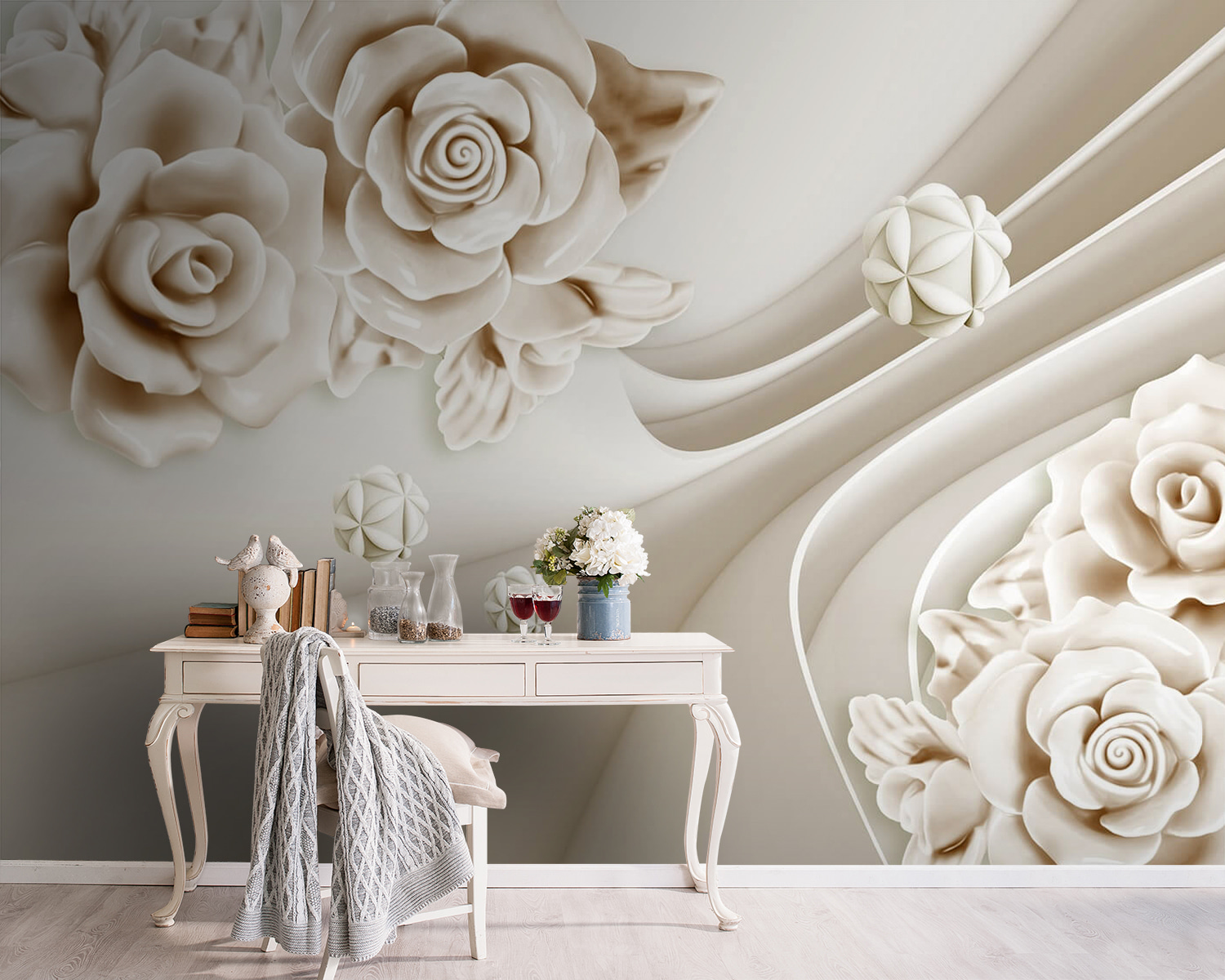 Transform your space with this enchanting mural featuring delicate white roses floating on gentle waves. Imagine stepping into a room that feels like a serene garden, where every glance invites a sense of calm. The elegant interplay of soft curves and floral accents creates a dreamy atmosphere, perfect for unwinding after a long day. Visitors might just find themselves lost in thought, admiring the artful balance of nature and design. Whether adorning a bedroom or a cozy reading nook, this mural whispers elegance—without shouting. It’s the kind of touch that makes everyday moments feel special, even if you’re just sipping coffee and staring at the wall. A subtle reminder that beauty can be found in the simplest details.