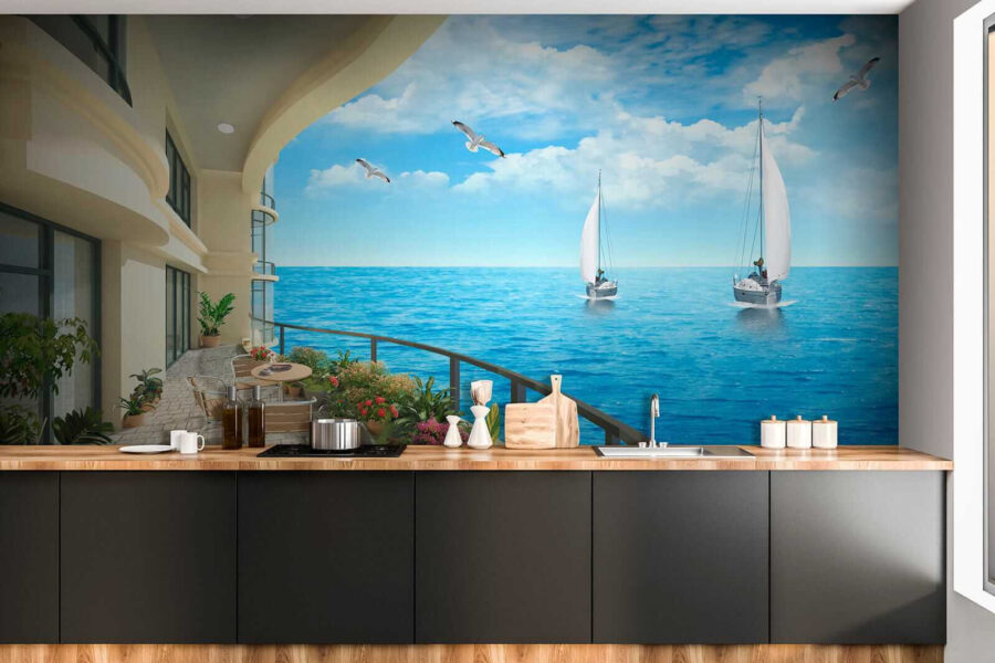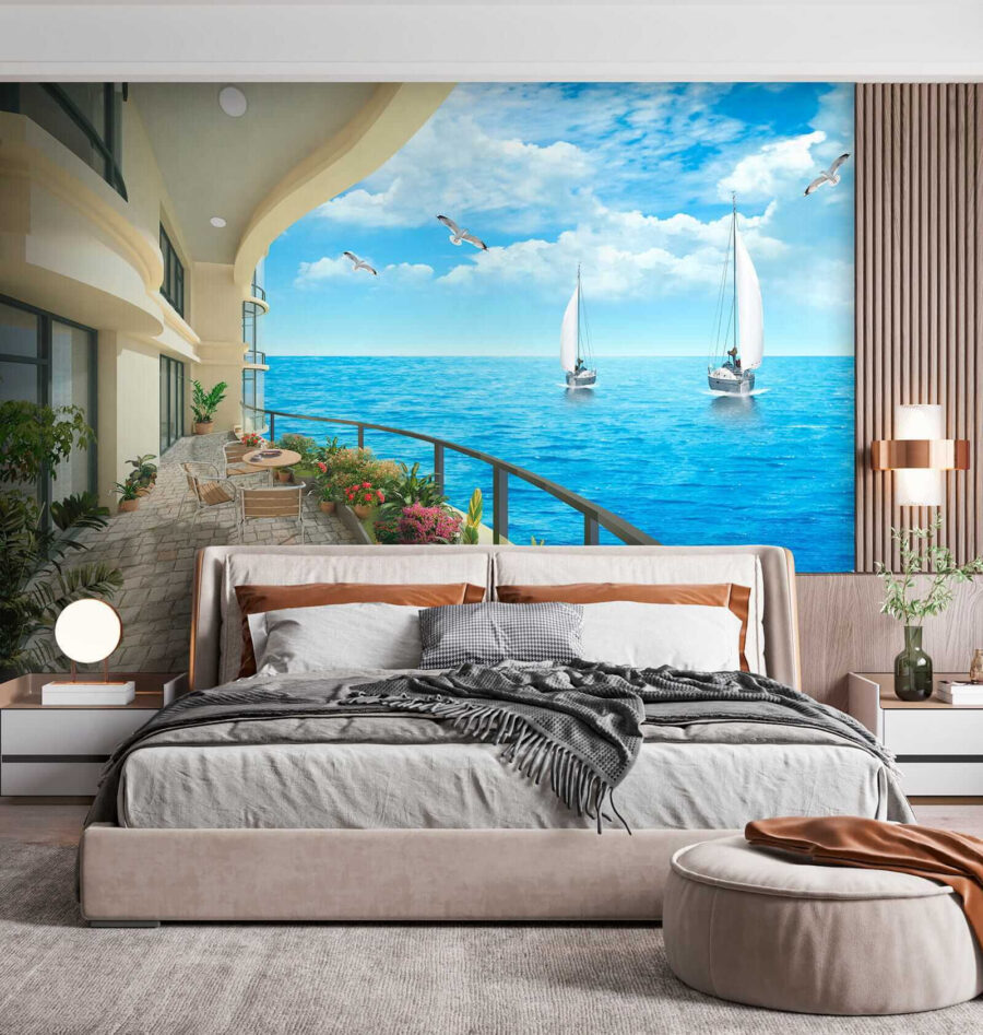 Představte si, že vstoupíte do místnosti, jejíž stěny k vašim smyslům přivádějí mořský vánek. Tato nástěnná malba s balkonem s nádherným výhledem na oceán a lodě líně plující po vodě promění jakýkoli prostor v přímořské útočiště. Představte si, jak popíjíte ranní kávu a vzduch naplňuje symfonie jemných vln a mořských ptáků – kdo by to nechtěl? Zářivá modř a svěží zeleň přímo vybízejí k relaxaci. Je to jako mít doma nekonečnou dovolenou a dopřát stěnám závan čerstvého mořského vzduchu. Ideální pro snílky nebo pro každého, kdo potřebuje ve svém životě trochu klidu. Stačí ji pověsit a nechat se unášet vlnami!