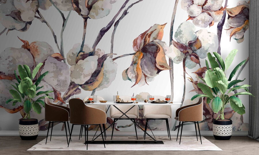 Proměňte svůj prostor pomocí této nádherné nástěnné malby s bavlněnými květinami. Představte si, že vstoupíte do útulného pokoje, který působí jako závan čerstvého vzduchu! Tyto křehké květy dokáží zjemnit atmosféru, takže i ty nejtěžší dny se budou zdát o něco lehčí. Navíc je na bavlně něco úžasně nostalgického, jako vzpomínky na slunečné dny a jemný vánek.