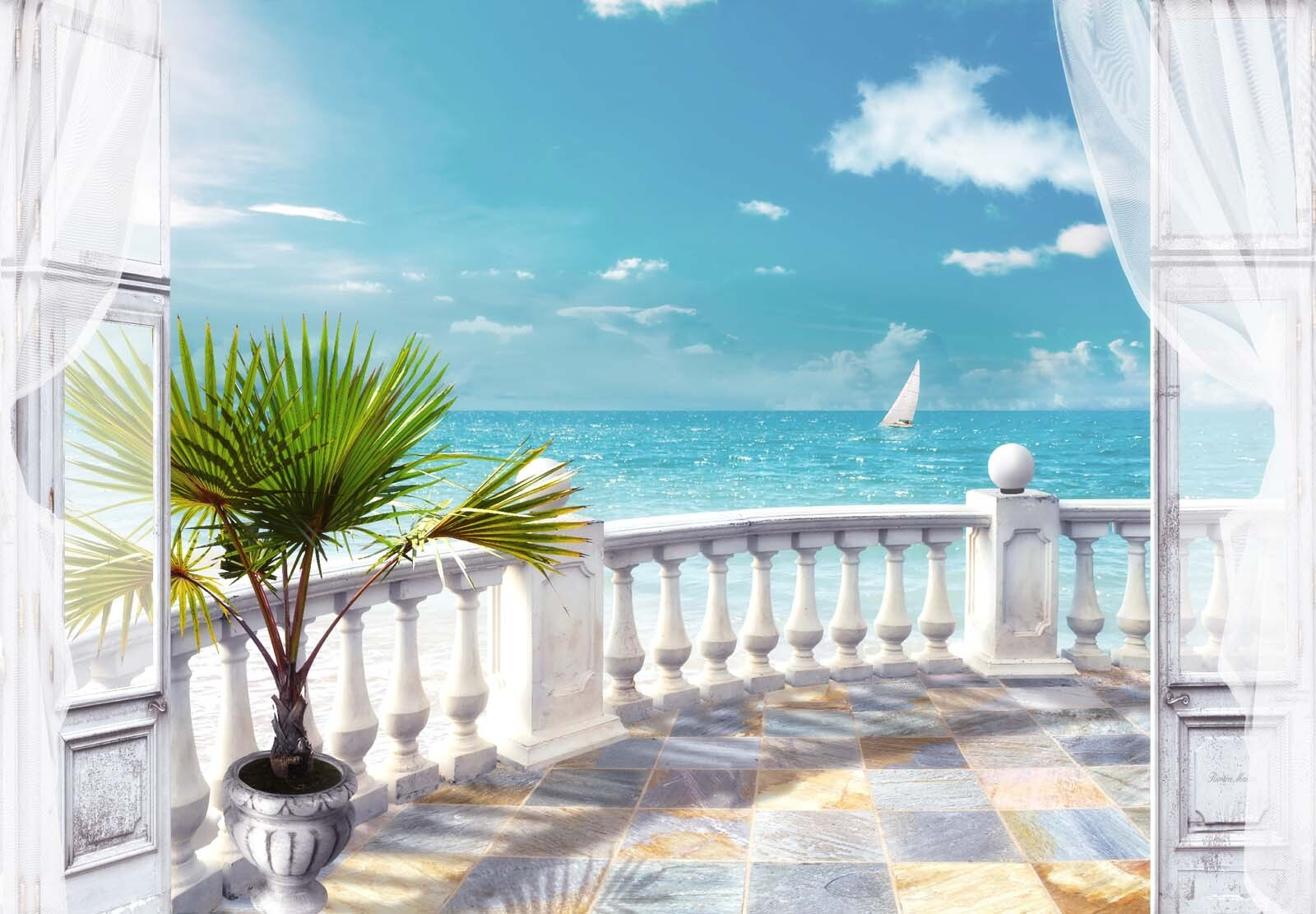 Představte si, že se každé ráno probouzíte s klidným výhledem na moře – je to jako váš osobní únik přímo domů. Tato nástěnná fototapeta “Palma v květináči na balkoně” vnese toto uvolněné pobřežní kouzlo do každé místnosti. Zdá se, že otevřenými dveřmi proniká vánek a šustí listy palmy. Vzdálená plachetnice pod nadýchanými bílými mraky dodává klidnou atmosféru. Ideální pro trochu snění… Už cítíte slunce na tváři? Ať už v domácí kanceláři, obývacím pokoji, nebo třeba v útulném čtecím koutku, tato nástěnná malba vybízí ke klidu a pocitu nekonečných prázdnin. Zkombinujte ji s měkkým prádlem nebo dekoracemi s mušlemi, abyste získali bezstarostnou atmosféru plážového domu – a to vše bez písku v botách!
