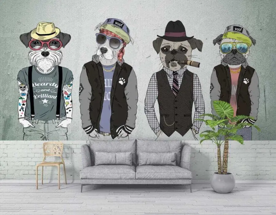 Podívejte se na tuto nepředvídatelnou a rozmarnou nástěnnou malbu psů oblečených tak, aby udělali dojem! Představte si čtyři módní štěňata – jedno z nich má vestu a kravatu jako malý psí podnikatel (samozřejmě včetně doutníku). Ostatní jsou oblečeni do cool oblečků, které křičí osobnost, od chladných stínů po hipsterské klobouky. Je ideální pro oživení dětského pokoje, místa pro posezení teenagera nebo dokonce tvůrčího prostoru mladé ženy. Tato nástěnná malba má uvolněnou, hravou atmosféru – takovou, která vás rozesměje pokaždé, když vejdete dovnitř. Jen si to představte: vejdete do pokoje a tam jsou oni, tito čtyři styloví chlupatí kamarádi, díky kterým máte pocit, že jste vstoupili na nějakou psí módní přehlídku nebo do animované filmové scény. Je to zábavné, je to vtipné… určitě to vyvolá konverzaci! A upřímně, komu by se nelíbil dotek tohoto rozkošného šiku na zdi?
