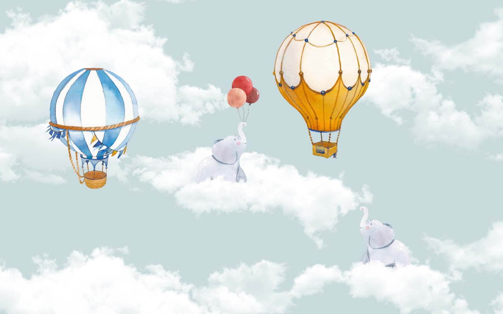 Představte si, že proměníte dětský pokoj ve snové dobrodružství – tato nástěnná malba “Horkovzdušný balón v oblacích” je tím pravým! Představte si rozmarné horkovzdušné balóny plující nadýchanými mraky a hravé slony, kteří se drží sladkých balónků. Je to jako vstoupit přímo do měkké, pastelové pohádkové knížky… Světle modrá obloha a jemné bílé obláčky vytvářejí uklidňující atmosféru – ideální pro rozproudění dětské fantazie nebo ukolébání do sladkých snů.