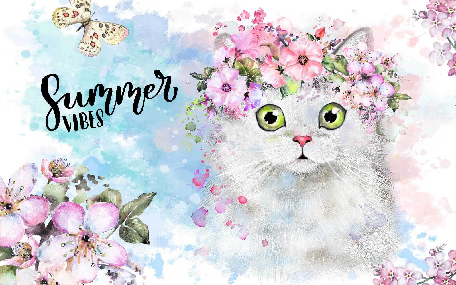 Proměňte každou místnost pomocí této nádherné nástěnné malby s okouzlující kočkou ozdobenou kyticí květin. Představte si, že vejdete do prostoru, kde vás vítá tato roztomilá tvář – je to jako chlupatý přítel, který vás povzbuzuje! Jemné akvarelové vibrace vytvářejí pocit klidu, ideální pro útulný koutek nebo živou hernu.