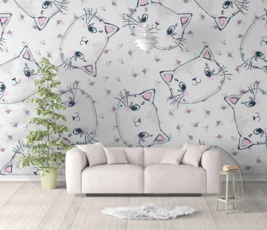 Transform any room into a cozy cat haven with this charming wall mural. Picture soft, fluffy kitty faces playfully scattered on a bright white backdrop, cuddling up with tiny pink flowers. It’s the kind of design that instantly brings a smile—like getting an unexpected cuddle from your own furry friend. Imagine sipping coffee while the kitties keep you company, or having a giggle as the little ones point and shout, “Meow!” This mural’s perfect for cat lovers or anyone wanting their space to feel warm and whimsical. Add a touch of playful charm that makes every day feel delightfully cheerful!