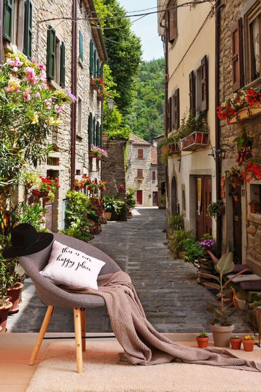Vstupte do zasněné, sluncem políbené uličky s nástěnnými malbami “Okouzlující ulička s živými květinami”. Tato nástěnná malba přenese kouzlo malebné evropské uličky přímo k vám domů – představte si ty jemné květináče hýřící barvami, které lemují dlážděné cesty. Ta zeleň prostě vypadá, jako by vynikala, že? Tato nástěnná malba je ideální pro každého, kdo potřebuje uniknout z každodenního shonu, a dodá každé místnosti nádech krásy inspirované přírodou. Představte si, že si ve svém novém útulném koutku čtete knihu, zatímco se “ulice” rozprostírá – je to jako mini dovolená bez starostí s balením! Přidejte tento dotek klidu a nechte živé květy rozzářit váš svět.
