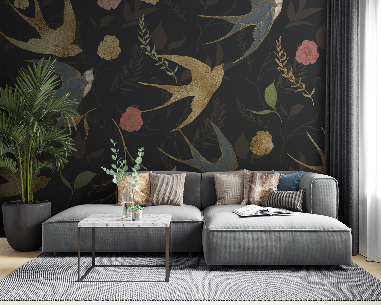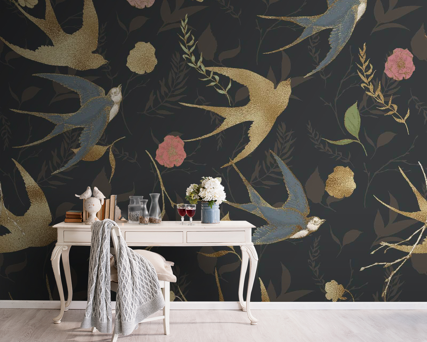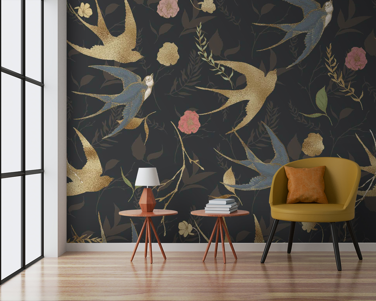 Proměňte jakýkoli prostor pomocí této nádherné nástěnné malby se vzorem rozmarných ptáků a okouzlujících květin. Představte si, že vstoupíte do svého pokoje a přivítají vás živé barevné víry – ti ptáci vypadají téměř jako v letu, připraveni vzít vás na dobrodružství. Květinové prvky dodávají jemné teplo, které vás vybízí k zastavení, nadechnutí a ocenění okolí. Je to jako mít zahradu a ptačí přátele přímo na stěnách, takže je ideální pro útulné večery nebo živá setkání. Přeneste přírodu dovnitř a nechte své stěny vyprávět vlastní příběh!