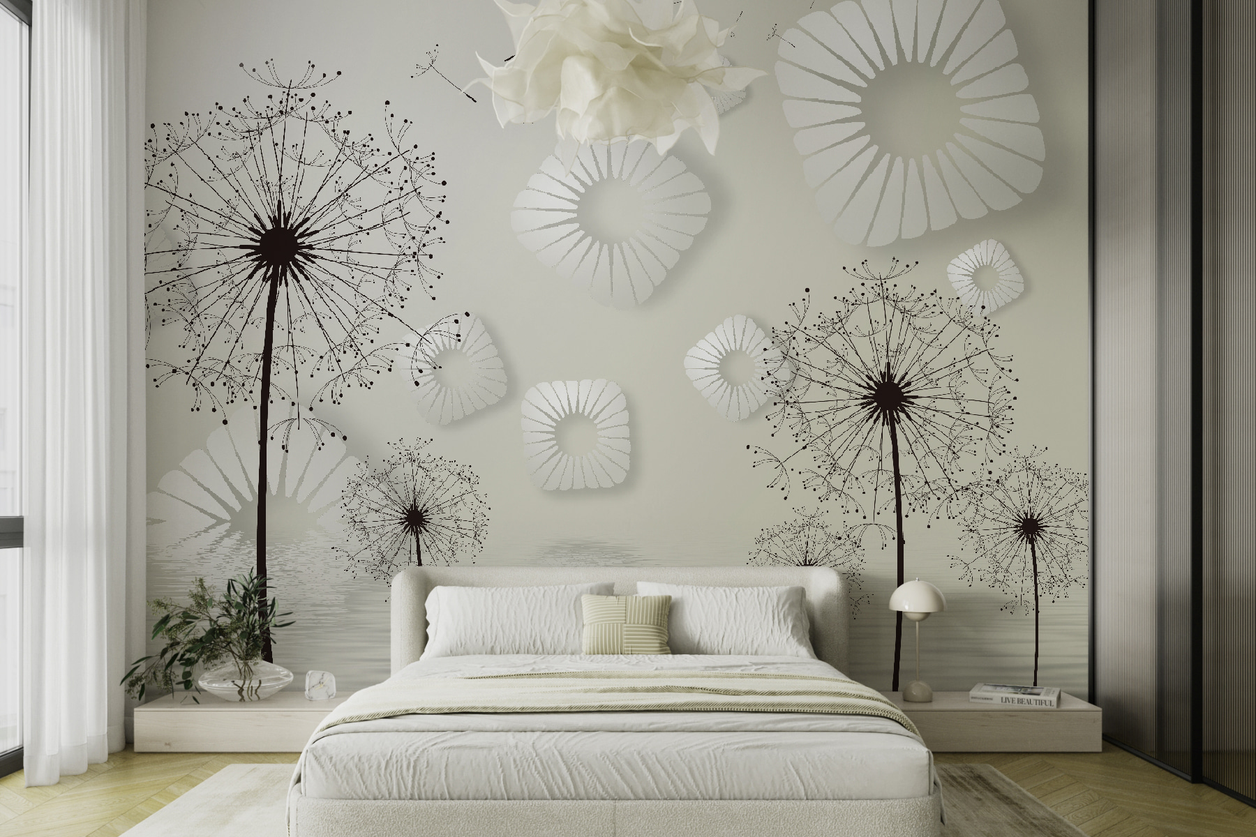 Proměna prostoru může působit jako kouzlo a tato nástěnná malba tuto atmosféru dokonale vystihuje. Představte si, že vstoupíte do místnosti vymalované jemnými pampeliškami, jejichž okouzlující, moudré tvary vybízejí ke snění a rozmarům. Bílé kruhové vzory se vznášejí jako obláčky a dodávají jim lehký, vzdušný nádech, který působí svěže a lákavě.