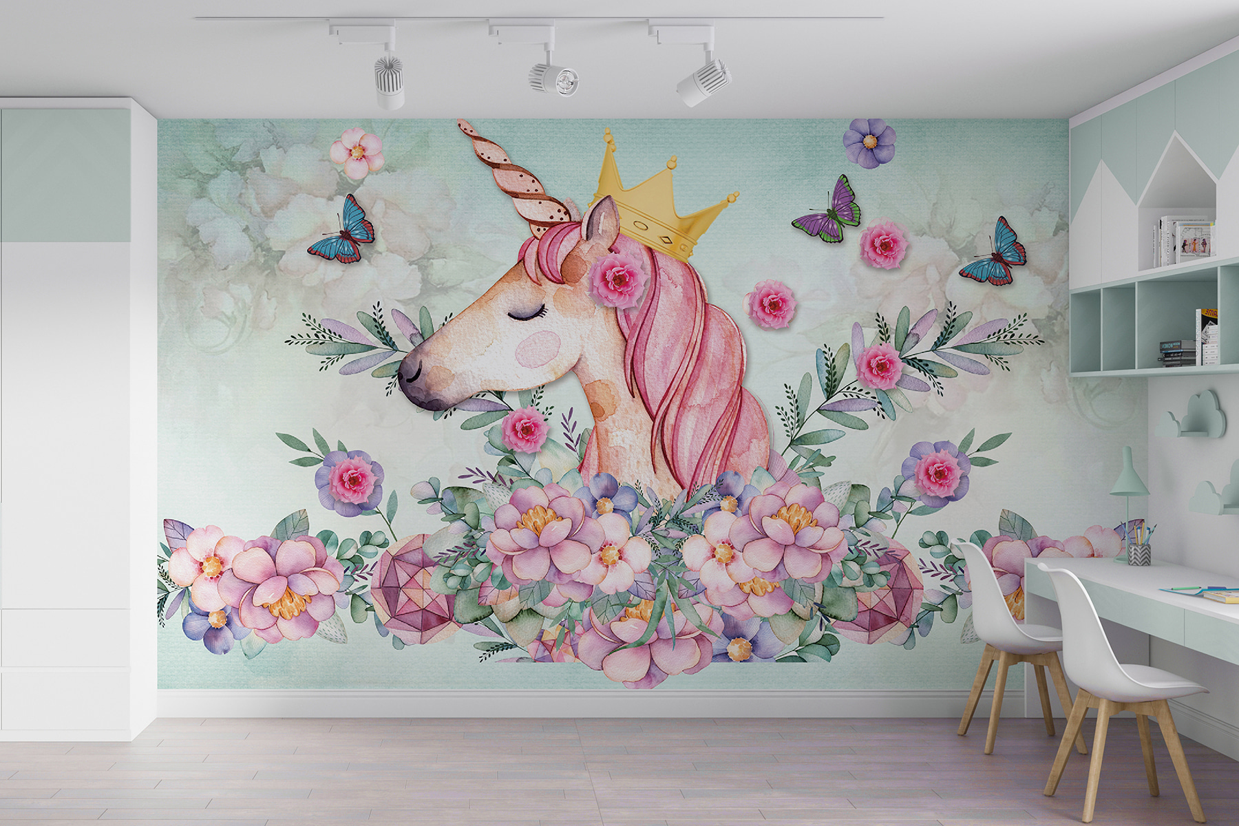 Přivítejte v dětském pokoji nádech rozmarného kouzla s touto okouzlující fototapetou! S půvabným jednorožcem s korunkou, obklopeným jemnými květinami a třepotajícími se motýly, je to jako vstoupit každý den do pohádky. Představte si, jak se oči vašeho děťátka rozzáří radostí a úžasem – naprosté štěstí!
