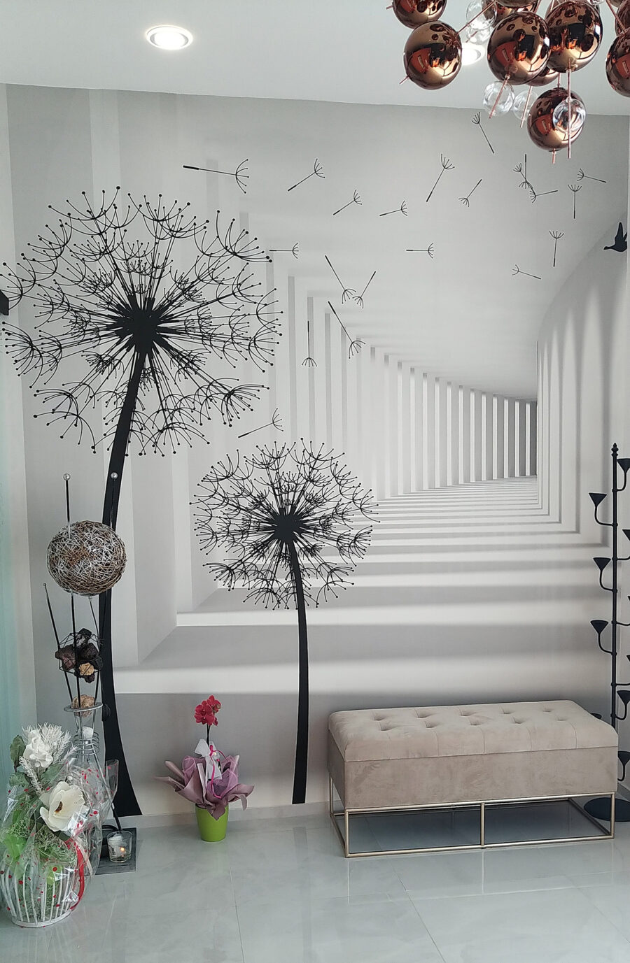 Představte si, že vstoupíte do místnosti a přivítá vás rozmarný tanec pampelišek! Tato nástěnná malba s názvem “Černá silueta pampelišky” přesně to dokáže – je to jako zachytit jemný, bezstarostný den v interiéru. Výrazné černé siluety na světlém pozadí vytvářejí úžasný kontrast. Skvělé je, že jako by roztahovaly prostor, díky čemuž se každá místnost zdá být větší… a otevřenější. Navíc je na těch plovoucích semínkách něco uklidňujícího, že? Skoro jako byste cítili, jak jimi vane jemný vánek.
