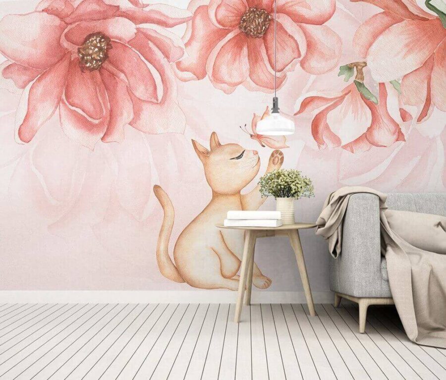 Proměňte svůj prostor pomocí této okouzlující tapety s motivem hravé kočky, která se snaží chytit motýla. Jemný akvarelový styl a něžné růžové květy vytvářejí snovou atmosféru, jako byste se procházeli sluncem zalitou zahradou. Umíte si představit snová odpoledne strávená s šálkem čaje nebo třeba improvizovanou taneční párty? Tato tapeta dodá každé místnosti šarm a špetku magie. Ať už ji použijete v útulném koutku nebo v hravém dětském pokoji, určitě vyvolá úsměvy a pocit tepla. Kdo by nechtěl mít pocit, že je v pohádkové knížce?