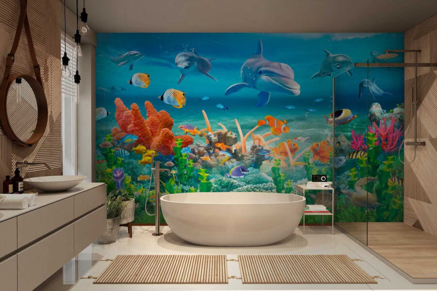 Představte si, že každé ráno otevřete oči a uvidíte příval radosti – tato živá nástěnná malba “Delfín plave ve vodě” vám to dokáže! Je ideální do dětského pokoje nebo do vašeho nepředvídatelného obývacího pokoje a je plná hravých delfínů a barevných mořských přátel. Dílo je tak živé – téměř očekáváte, že ti veselí delfíni vyskočí ze zdi! Je to jako mít okno do podmořského ráje bez písku v botách. Tato nástěnná malba vnese přímo do vašeho prostoru kapku přímořské blaženosti a nádech rozmarnosti. Ponořte se do světa fantazie a sledujte, jak se místnost rozzáří úsměvy a chichotáním. Není to jen dekorace – je to zážitek.