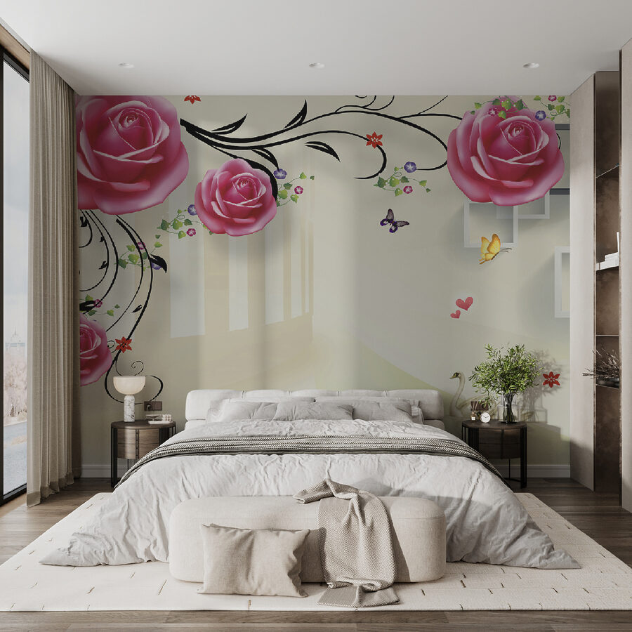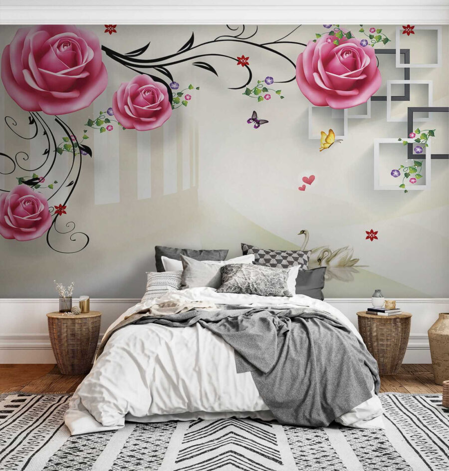 Představte si, že se každý den probouzíte s touto fascinující freskou – je to jako vstoupit do snové zahrady! Labutě ladně klouzající pod rozkvetlými růžovými růžemi, kolem kterých poletují motýli, dodají vašemu prostoru nádech klidného kouzla. Ideální pro každého, kdo chce do interiéru vnést kousek přírody s nádechem elegance. A ty růže – vypadají, jako byste se jich mohli dotknout!