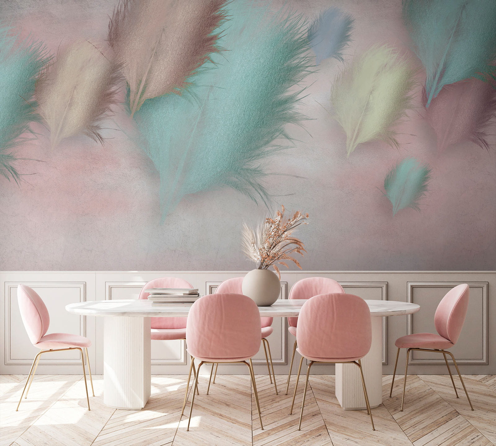 Proměňte jakoukoli místnost v útulné útočiště s touto snovou tapetou „Skupina peří na růžovém pozadí“. Je to jako obalit svůj prostor jemným pastelovým objetím. Každé peříčko lehce tančí po růžovém plátně a vybízí k myšlenkám na jemný vánek a lenošné odpoledne. Představte si, jak popíjíte čaj nebo kávu a vychutnáváte si uklidňující atmosféru – možná si dokonce představujete hluboké rozhovory se zdí. Ideální pro dětské pokoje, obývací pokoje nebo kdekoli, kde je potřeba trochu klidu. Tato tapeta není jen dekorací, je to malý úkryt přímo u vás doma!