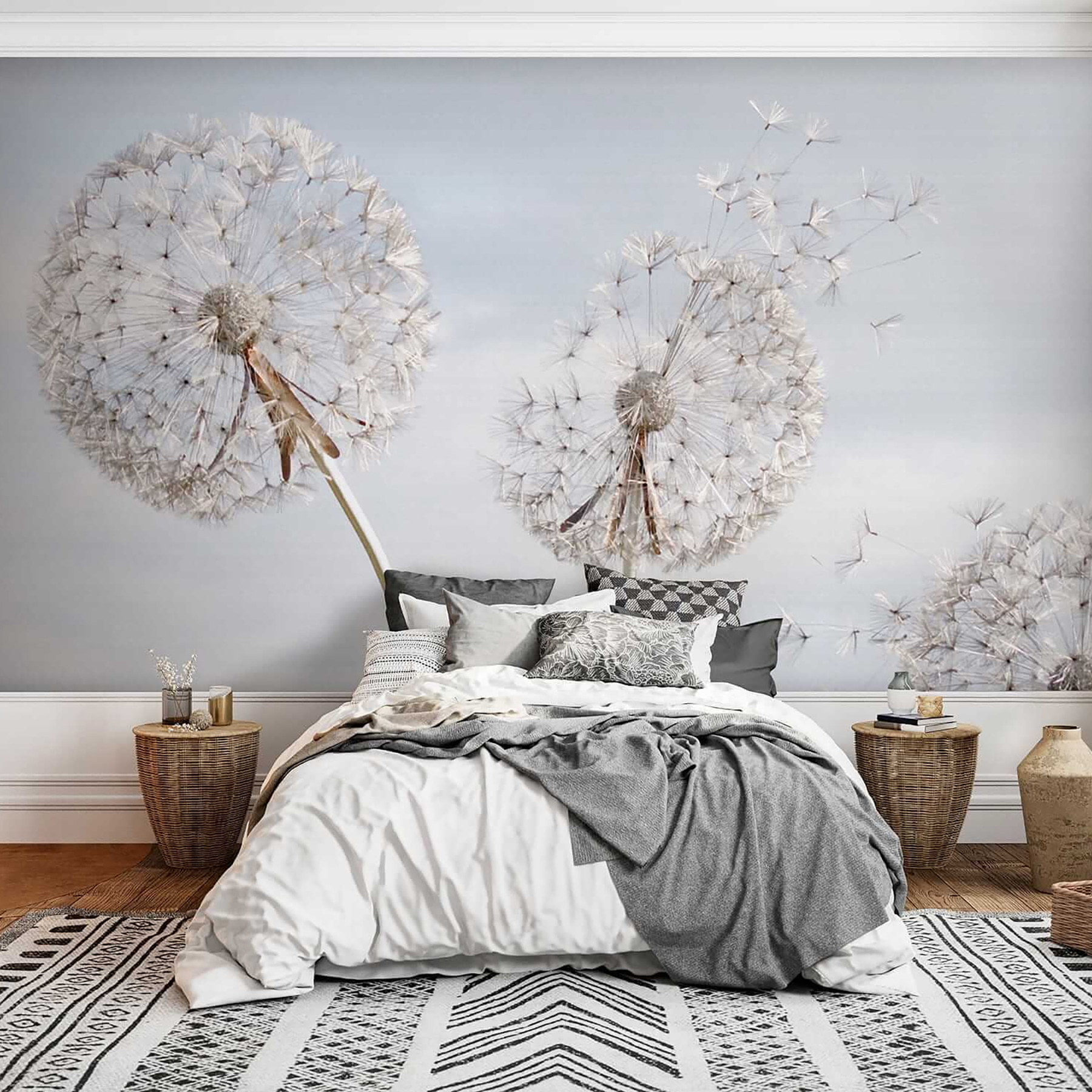 Není tato nástěnná malba prostě fascinující? Představte si, že vejdete do místnosti, kterou zdobí tento obraz “Obří pampelišky pohupující se ve vánku” – téměř cítíte, jak jemný vítr rozfoukává ta nadýchaná semínka. Je to jako přenést do interiéru kus přírody, ale s příměsí magie. Tato nástěnná malba přistane přesně na místě, kde se mísí ty elegantní “Květy” a náznak “3D” zázraku, který bez námahy promění jakýkoli prostor.