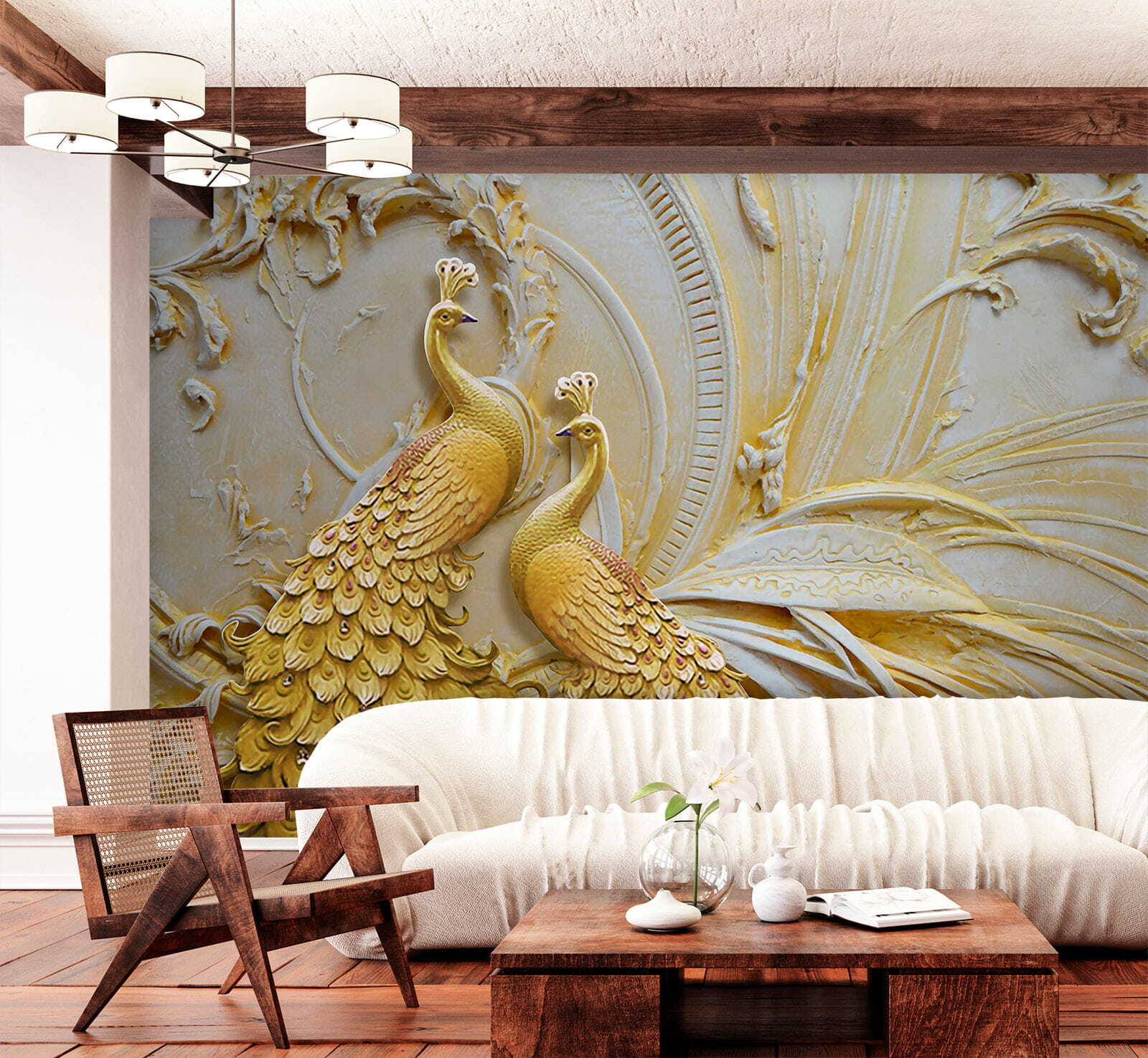Proměňte svůj prostor díky půvabu elegantních pávů ve složitém reliéfu. Tato nástěnná malba není jen dekorací na zeď, ale také podnětem ke konverzaci. Představte si, že vejdete do místnosti a okamžitě se cítíte přeneseni do klidné zahrady. Tito opeření krasavci jako by tančili a vnesou na vaše stěny teplo a osobitost. Jemné odstíny dodávají nádech klidu, takže se skvěle hodí do útulného obývacího pokoje nebo klidné ložnice. Každý pohled na nástěnnou malbu může inspirovat ke snění o exotických cestách nebo líném odpoledni při popíjení čaje. Je to jako mít umělecké dílo, které vdechne život vaší každodenní rutině. Kdo by se nechtěl probouzet s takovým nádherným výjevem?