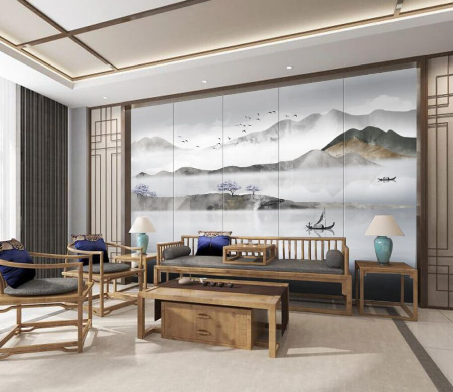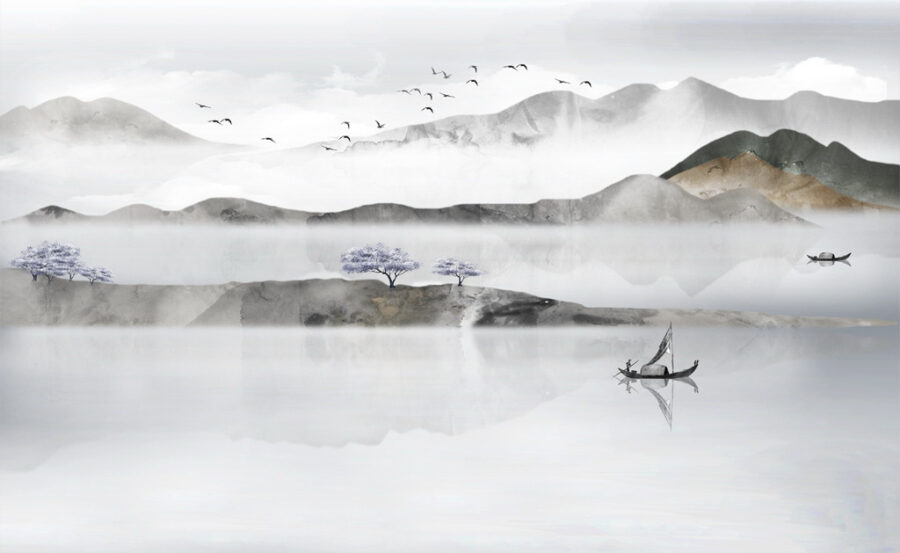Tady je nástěnná malba, díky které si budete připadat, jako byste se vznášeli v klidné říši snů. Představte si, že popíjíte ranní kávu a díváte se na tento uklidňující výjev osamělé lodi plující po zrcadlovém jezeře obklopeném mlžnými horami. Ach, ten klid… Možná zapomenete, že jste v obývacím pokoji! Má to kouzelnou zenovou atmosféru, která vás vtáhne dovnitř – jako by vám hory a loďka chtěly pošeptat svá tajemství. Ideální pro lidi, kteří touží po klidu nebo umělecké inspiraci ve svém prostoru. Téměř cítíte jemné šumění stromů nebo jemné vlnění vody… Nadechněte se, relaxujte a možná se i ztratíte v myšlenkách. Kdo ví? Najednou váš domov není jen domovem – je to klidné útočiště.