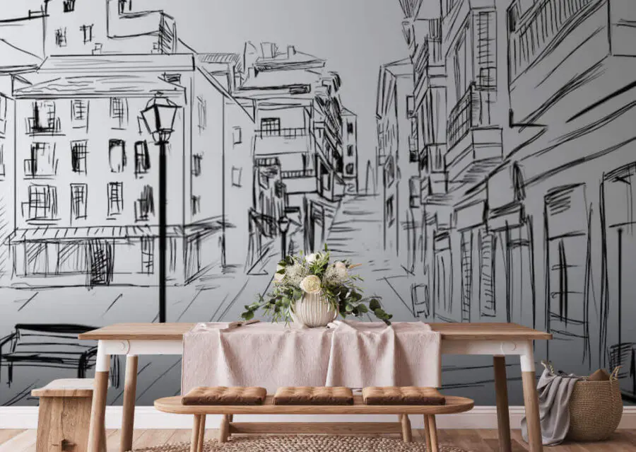 Představte si, že si lebedíte v obývacím pokoji s touto úžasnou černobílou fototapetou na zdi. Je to jako náladová skica, která ožila! Hravé linie zachycující městskou scénu – doplněnou osamělou lavičkou a vysokými budovami – přinášejí umělecký vkus, který vás donutí snít o evropských ulicích.