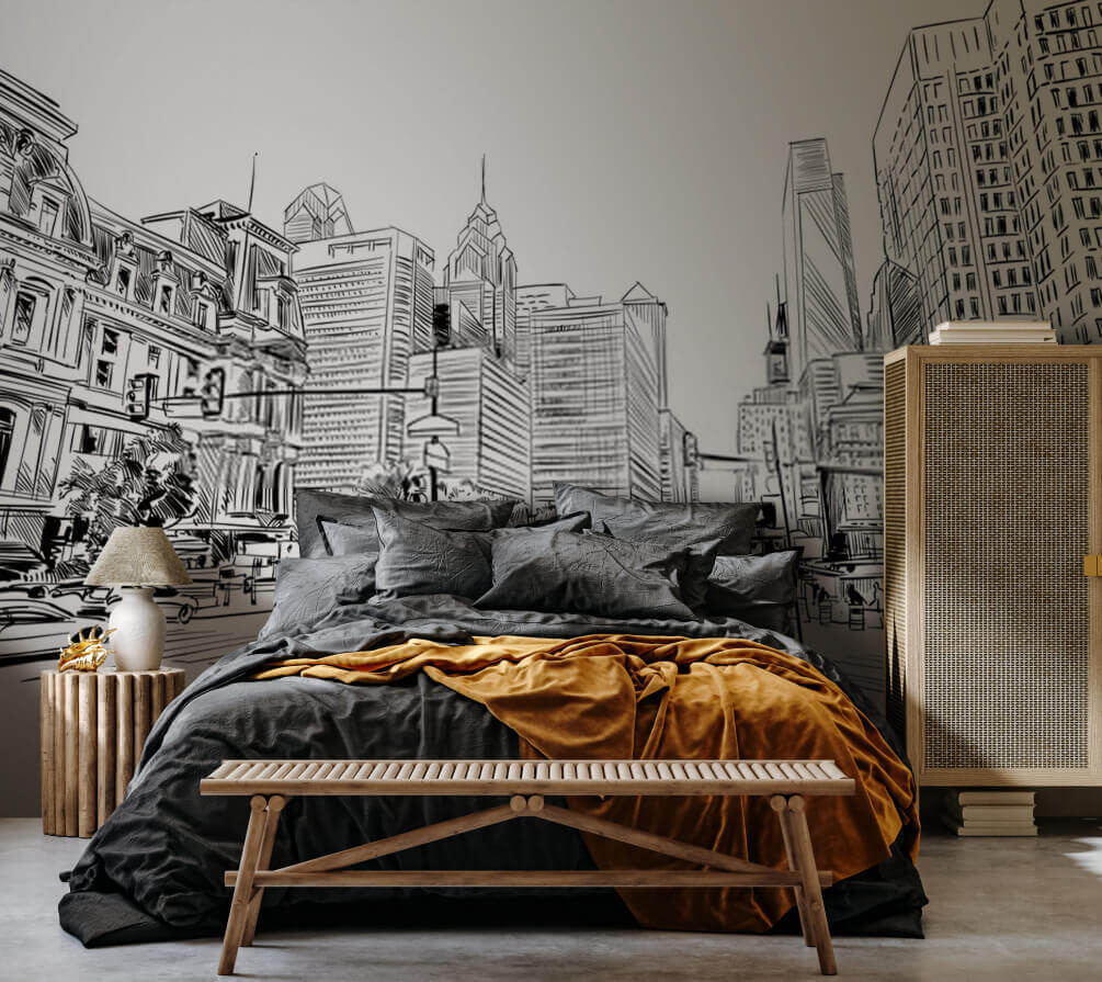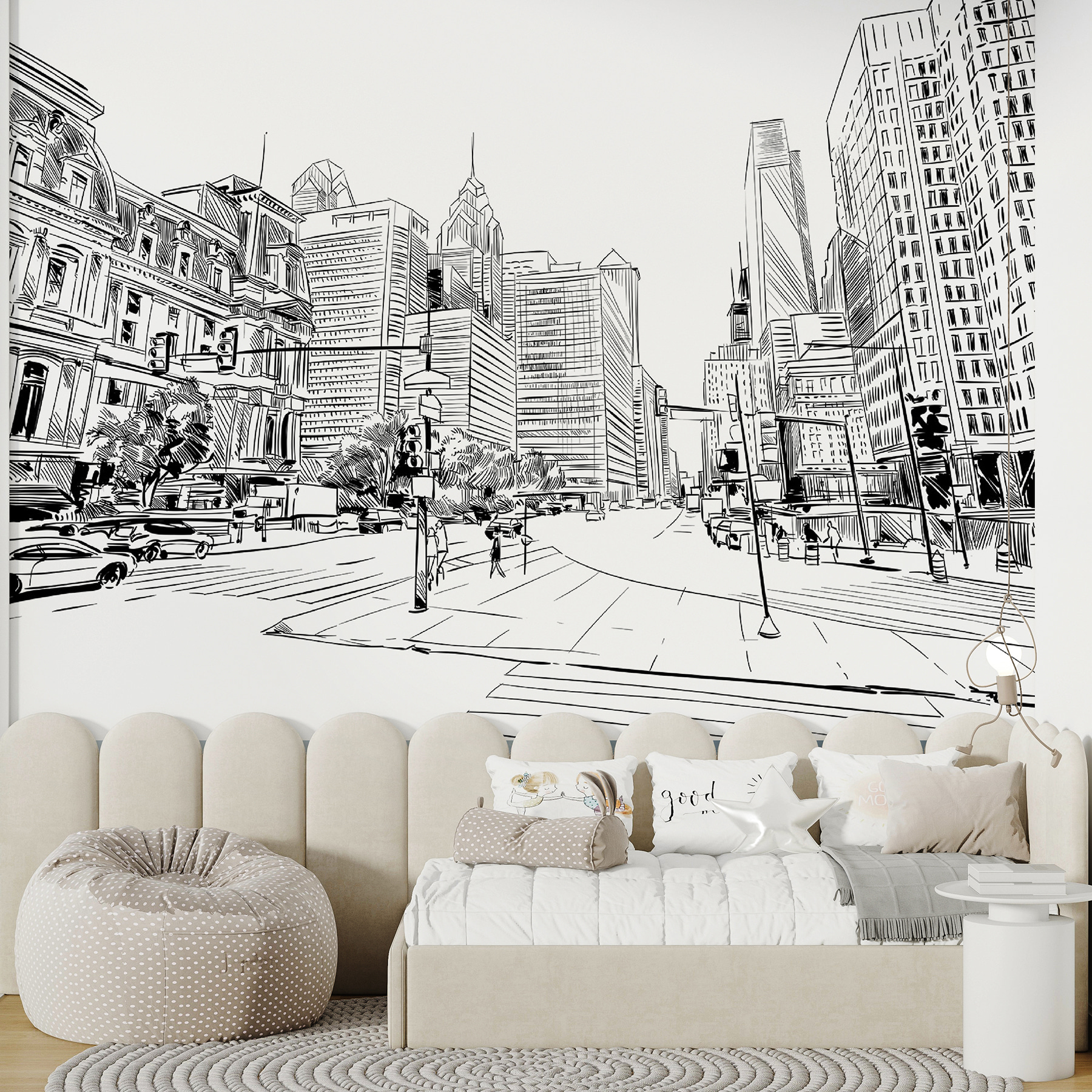 Ahoj! Podívejte se na tuto skvělou nástěnnou malbu – je to černobílý náčrtek městské krajiny, který vypadá jako z grafického románu. Dokážeš si představit, že by ses s tímhle probudil? Je to jako mít rušné město přímo ve svém obýváku, bez hluku a davů. Ideální pro dodání městské elegance vašemu prostoru, že?