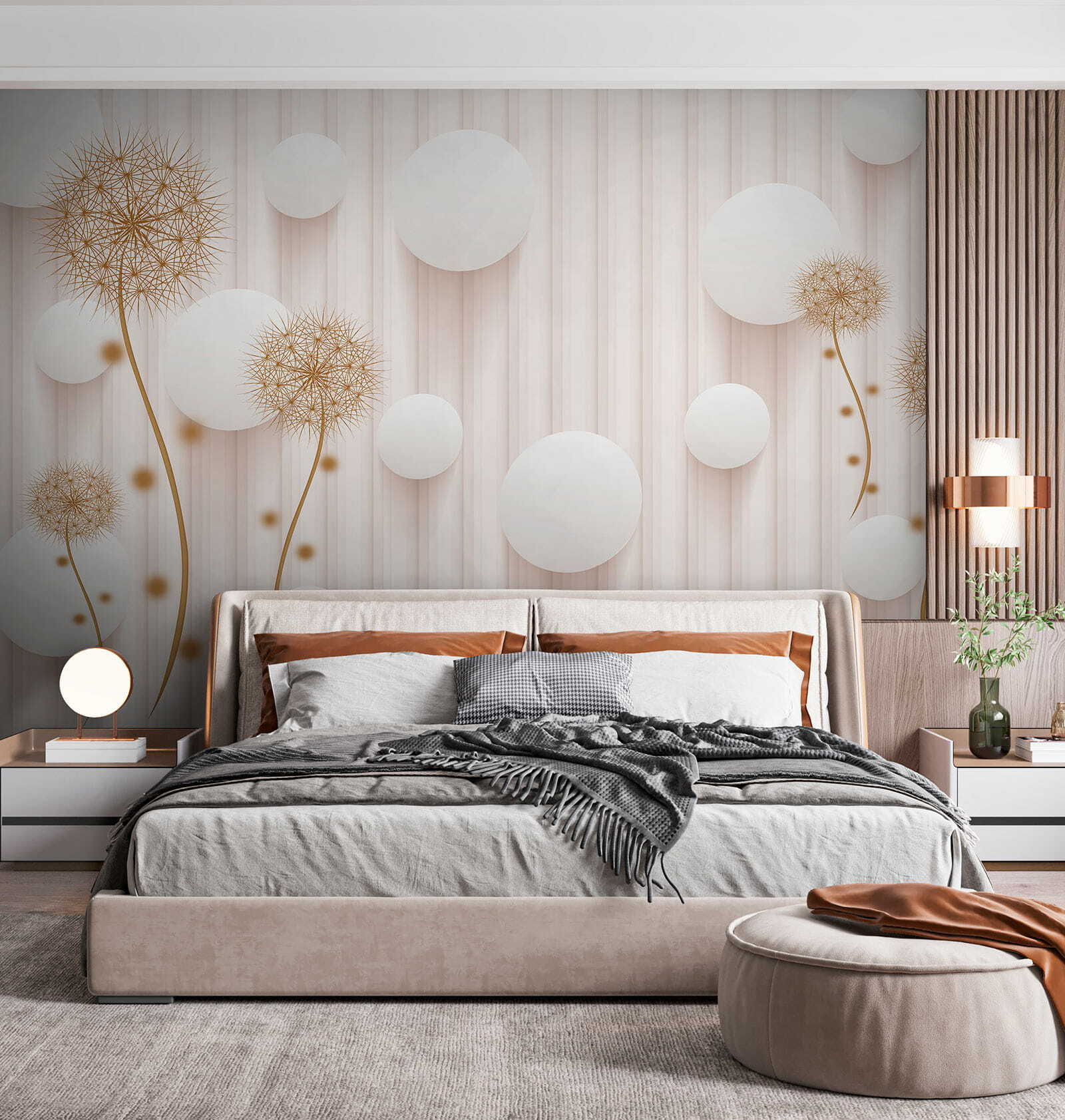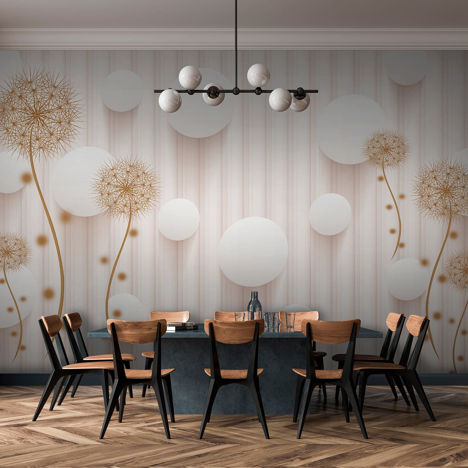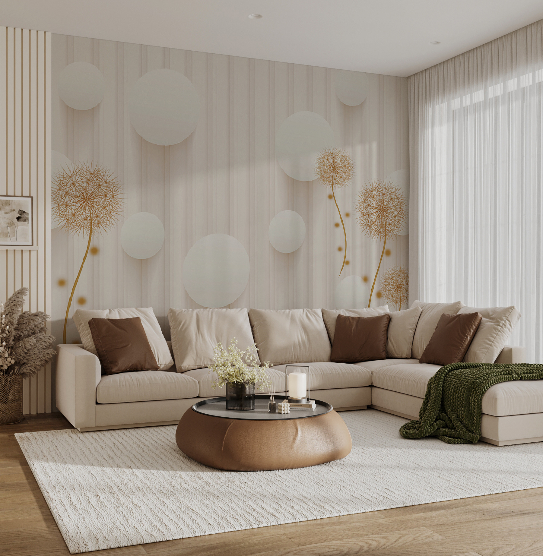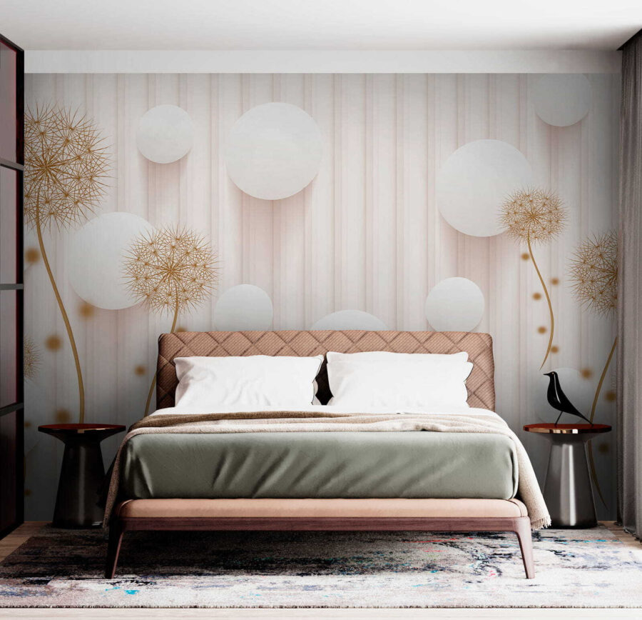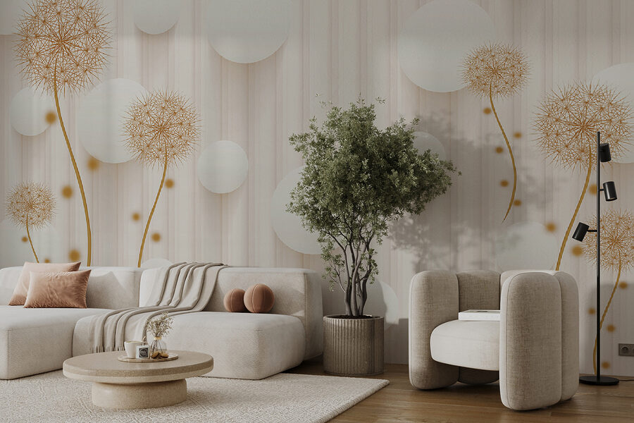Proměňte jakýkoli prostor díky rozmarnému kouzlu nástěnné malby “Bílé kruhy a pampelišky”. Představte si, že vejdete do místnosti, kde pampelišky hravě tančí vedle vzdušných bílých kruhů a vytvářejí lehkou, zasněnou atmosféru. Jako by vám stěny šeptaly tajemství slunečních paprsků a jemného vánku. Tato nástěnná malba, která se skvěle hodí do útulného čtecího koutku nebo světlého vchodu, dodá přírodě kouzlo bez pylových alergií! Hosté se budou usmívat, děti žasnout a vy se možná přistihnete, že se dokonce zasníte. Kdo by řekl, že nástěnná malba může vyvolat takovou radost? Jen si to představte – jasná rána s kulisou, která působí jako svěží jarní den, a to po celý rok. Dokonalé, že?
