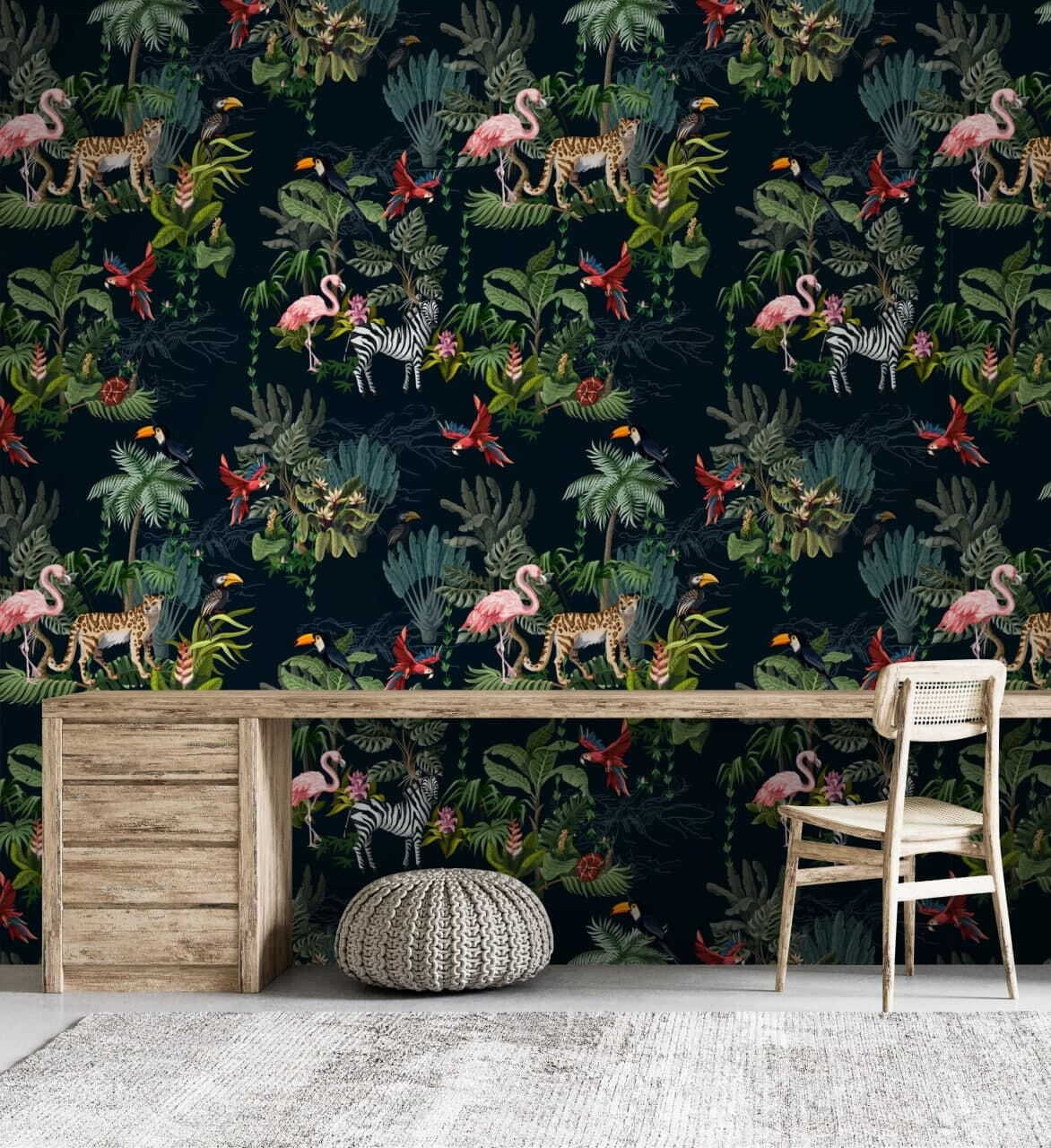 Transform any wall into a vibrant escape with this stunning mural featuring flamingos and zebras amidst lush tropical foliage. It’s like bringing a little piece of the wild right into your living room—or your bathroom, if you’re feeling bold! Imagine stepping into a lush jungle every time you walk by. The rich colors pop against a darker background, making it the perfect backdrop for cozy gatherings or solo relaxation. Plus, it’s a great conversation starter—who doesn’t love a chat about exotic wildlife? This mural isn’t just decor; it’s an experience. So, upgrade that plain wall and let the jungle vibes flow!