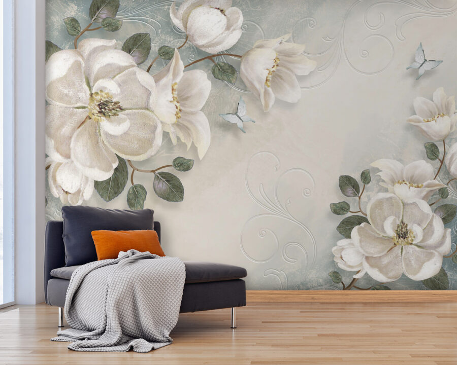 Transform your space into a serene retreat with this enchanting wall mural featuring delicate white flowers and leaves against a soft background. It’s like bringing a garden indoors—minus the watering can. Imagine sipping coffee in a room where petals seem to dance on the walls, evoking a calm, spa-like vibe. The light colors create an airy feel, making even the coziest corners seem spacious. Friends might just think you’ve unlocked the secret to effortless elegance. Perfect for creating a warm atmosphere, this mural whispers tranquility, inviting everyone to pause and breathe. A little touch of nature can go a long way.