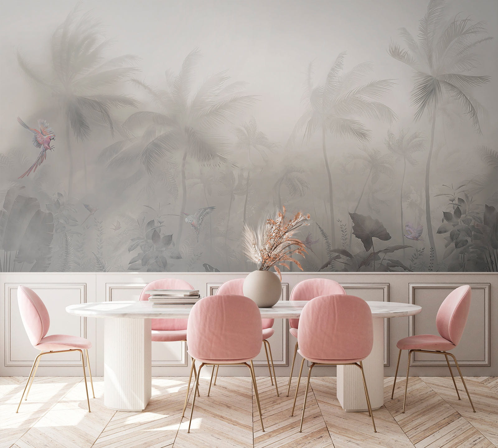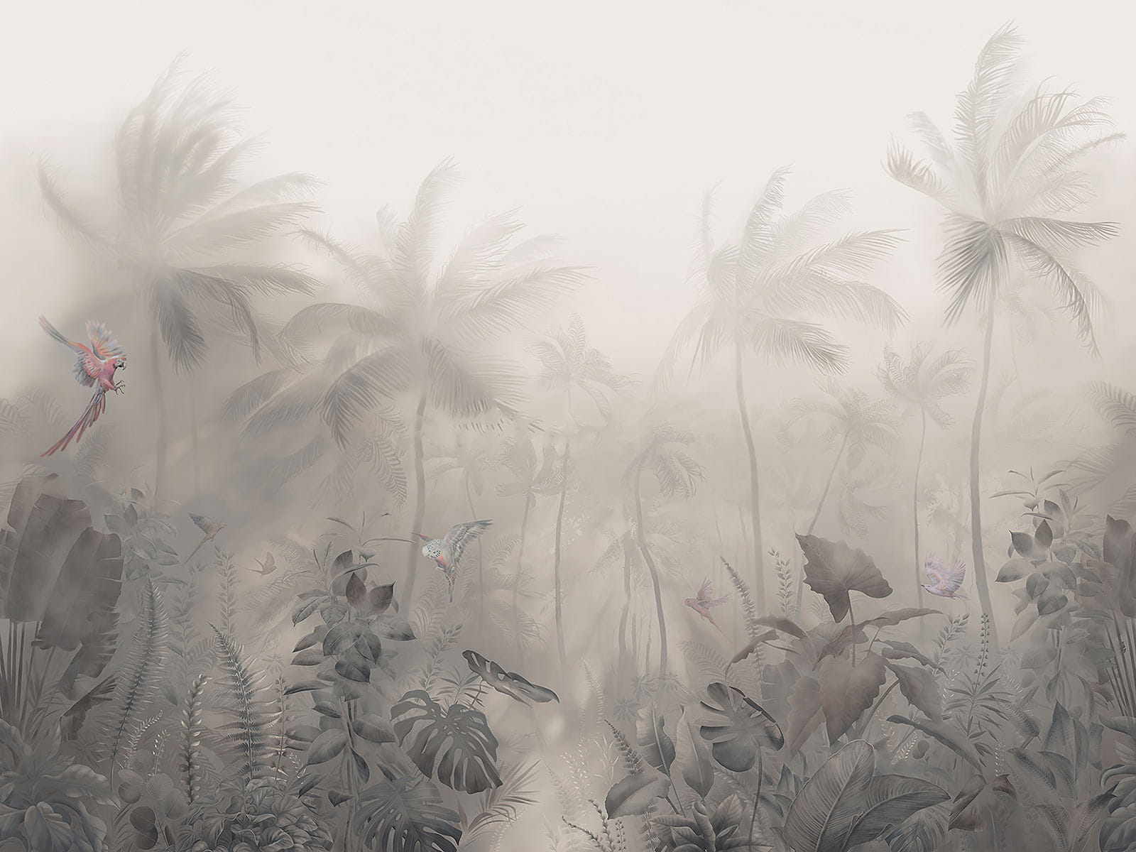 Proměňte jakýkoli prostor v pohádkové útočiště s touto okouzlující tapetou „Zamlžený les s palmami a motýly“. Pokaždé, když kolem ní projdete, budete mít pocit, jako byste vstoupili do klidného tropického útočiště. Tyto křehké tvorečky poletující kolem dodávají tapetě nádech fantazie a vy se budete cítit jako v pohádce. Jemné mlhavé odstíny navozují klidnou atmosféru, ideální pro snění nebo příjemné povídání u kávy. Představte si ji za měkkým křeslem, které promění váš čtecí koutek v osobní oázu. Kdo by se tu necítil uvolněně? Tato tapeta je vaší vstupenkou do bezstarostné ostrovní atmosféry, aniž byste potřebovali opalovací krém!
