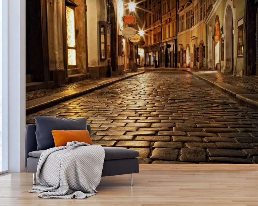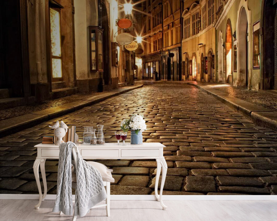 Proměňte jakýkoli pokoj v útulný kout okouzlujícího města s touto fototapetou „Kamenná ulice s budovami a pouličními lampami“. Představte si, že vstupujete do scény, kde se dlažební kostky lesknou pod měkkým svitem pouličních lamp. Je to jako pozvat si kousek fantaskní noční procházky přímo do svého domova. Teplé odstíny vyvolávají pocit nostalgie, takže se perfektně hodí do jídelního koutu nebo relaxačního čtenářského koutku. Představte si, jak se zachumláte s knihou a popíjíte svůj oblíbený čaj, obklopeni příjemným pocitem večerní procházky. Ideální pro ty, kteří touží po troše městské magie!