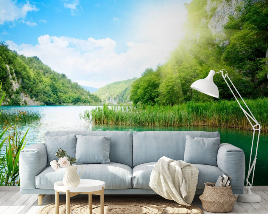 S touto podmanivou nástěnnou malbou s klidnou vodní plochou obklopenou svěží trávou a stromy proměníte každou místnost v klidné útočiště. Představte si, že sedíte ve svém oblíbeném křesle, v ruce držíte knihu a posloucháte jemné šumění listí a jemné šplouchání vody – je to mini dovolená přímo u vás doma! Zářivá modrá a zelená barva vdechne vašemu prostoru svěží život, takže i ty nejnudnější kouty budou působit lákavě. Navíc je ideální pro snění o letních piknicích nebo líných odpoledních u jezera. Kdo by netoužil po troše přírodou inspirovaného chladu ve svém interiéru? Přeneste venkovní atmosféru dovnitř; je to jako závan čerstvého vzduchu, aniž byste museli opustit dům.