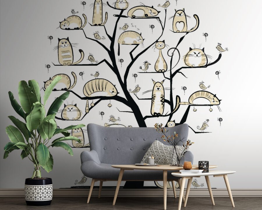 Představte si fantaskní strom, jehož větve jsou hravě ozdobeny kočkami všech tvarů a velikostí – některé dřímou, jiné plánují epická dobrodružství. Tato nástěnná malba není jen uměleckým dílem, ale také originálním tématem k rozhovoru. Představte si ji v útulném koutku, kde se scházejí přátelé a vzduch je plný smíchu. Jemné neutrální tóny vytvářejí klidnou atmosféru, ideální pro líné neděle, kdy si chcete jen popíjet kávu a užívat si kouzlo svého prostoru. Je to jako mít kočičí rodinu přímo na zdi, vždy připravenou bavit – nebo zdřímnout si. Milovníci koček? Budou nadšení.
