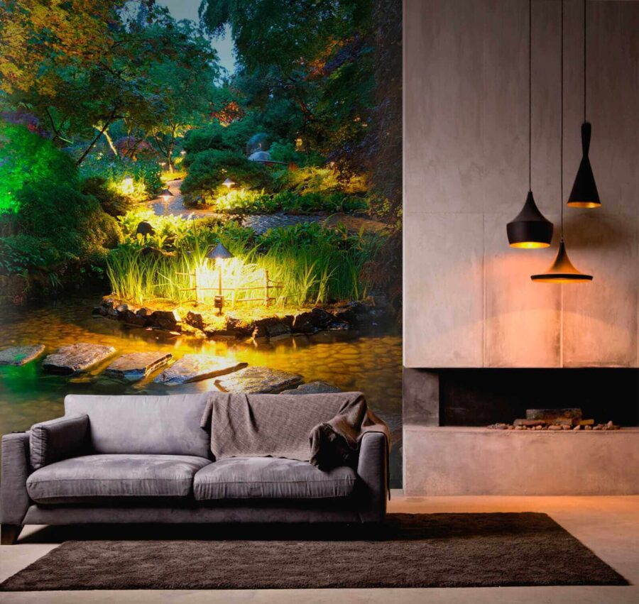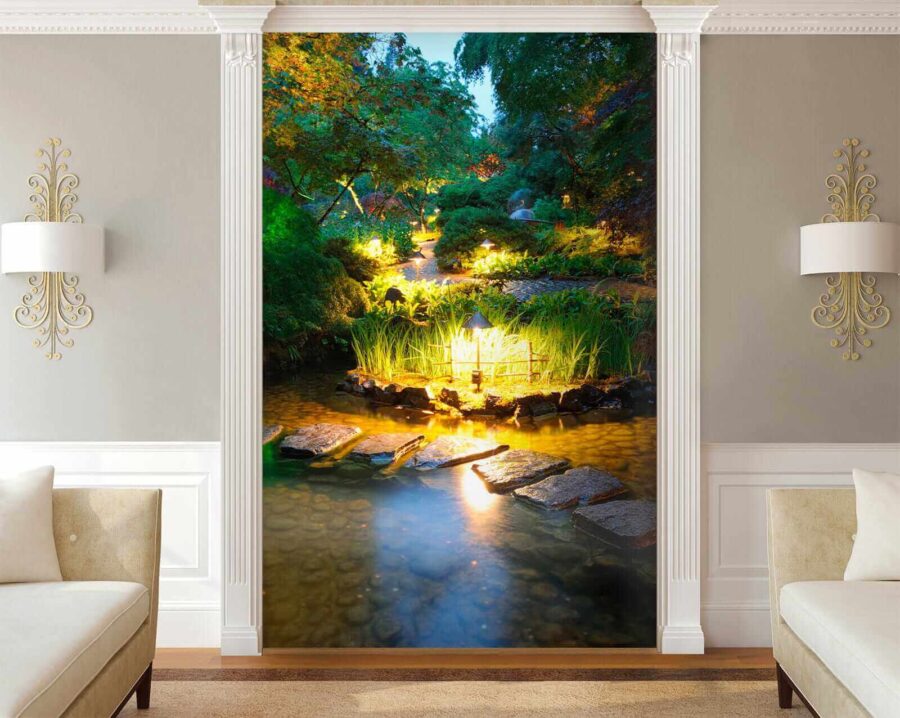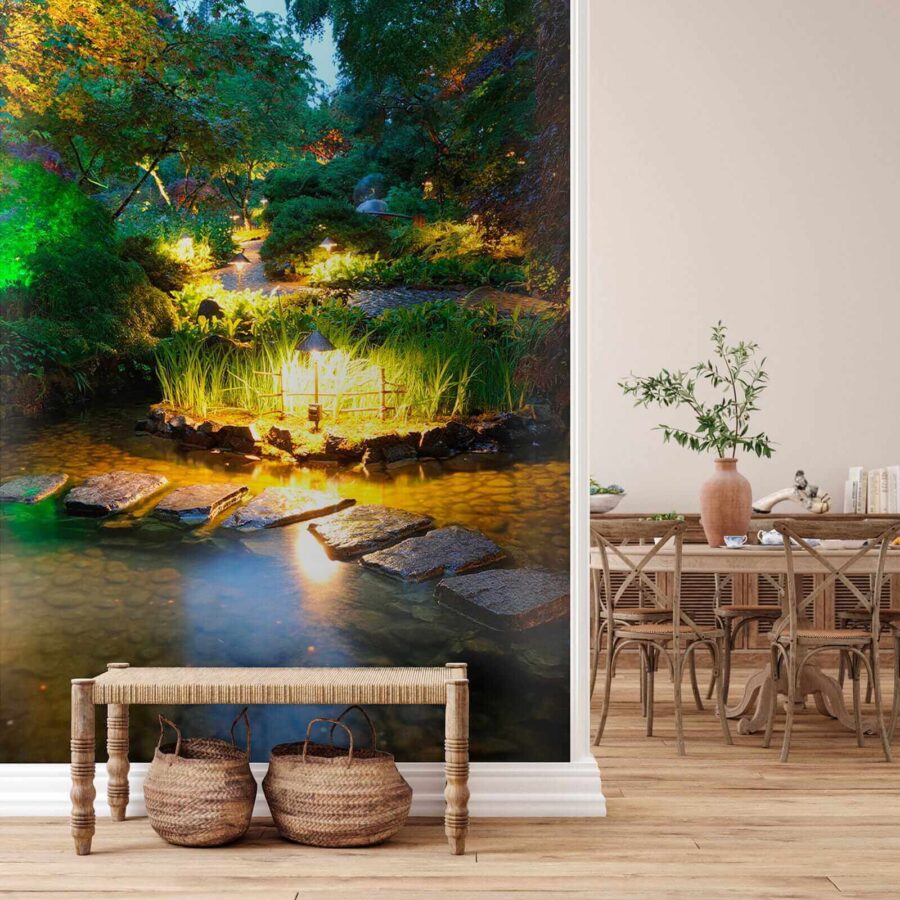Proměňte jakýkoli prostor pomocí okouzlující tapety „Kamenná stezka v jezírku se světly“. Představte si, že vstoupíte do klidného útočiště přímo ze svého obývacího pokoje! Tato tapeta vás obklopí uklidňujícími odstíny a jemně se třpytícími světly, takže budete mít pocit, jako byste se procházeli skrytou zahradou za soumraku.